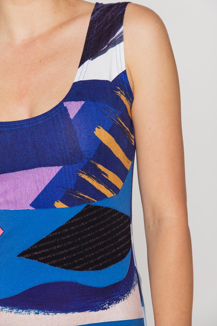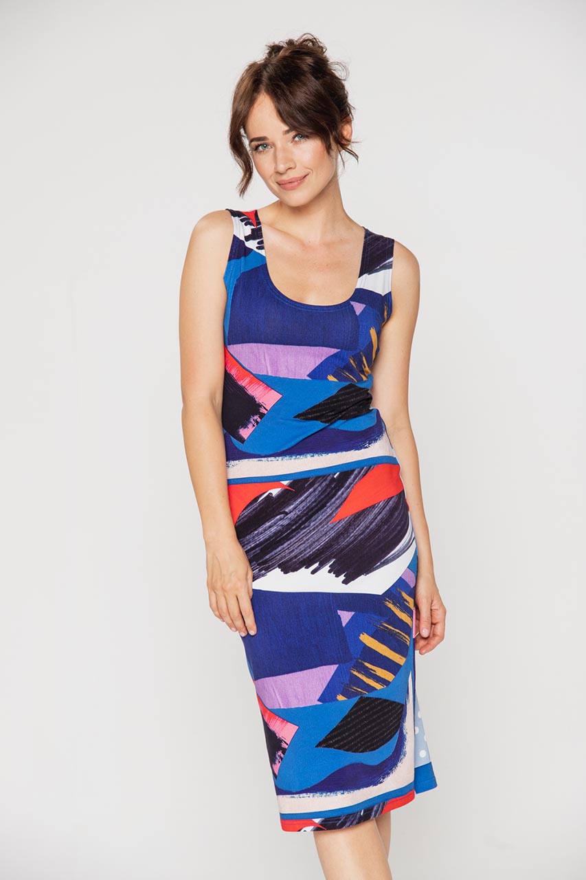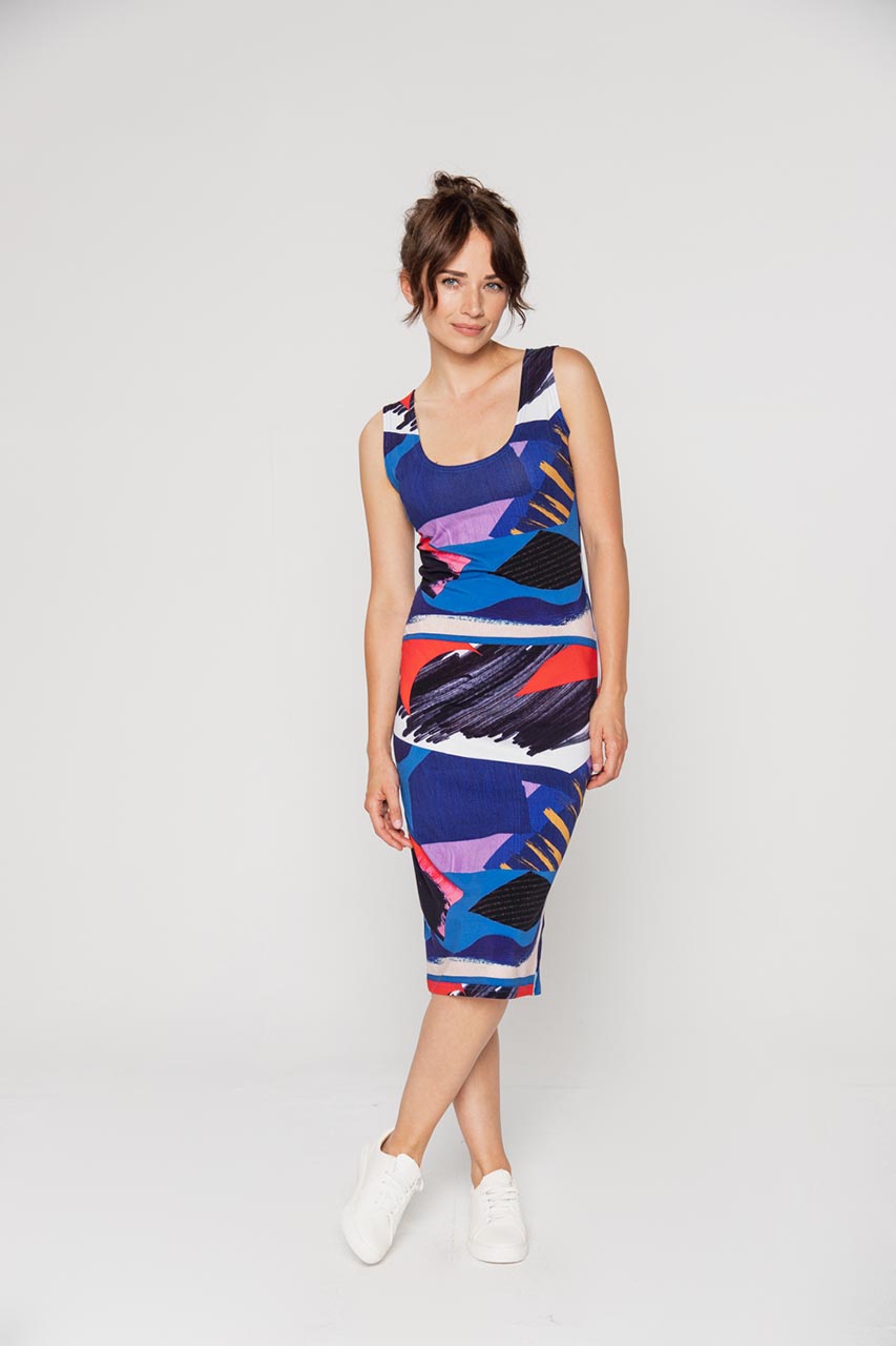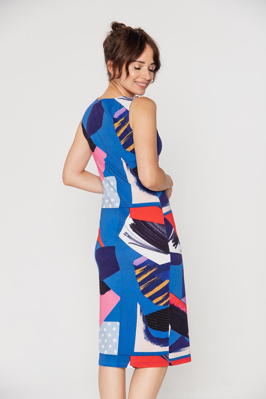 Sukienka midi na grubych ramiączkach. Model z abstrakcyjnym wzorem w odcieniach czerwieni, fioletu oraz niebieskiego. To komfortowa propozycja na co dzień, która sprawdzi się zwłaszcza w letnie dni. Tkanina to elastyczna bawełna we wzory, która pozwala zestawić sukienkę z rozmaitymi dodatkami. Warto tą sukienkę zestawić z jeansową kataną oraz sneakersami. Taki strój to letni must have na spotkanie z przyjaciółkami, wyjście na zakupy czy też grilla w ogrodzie.