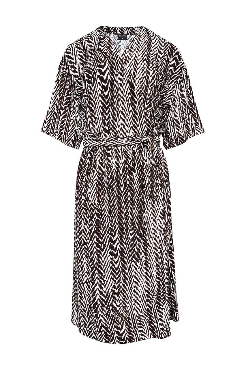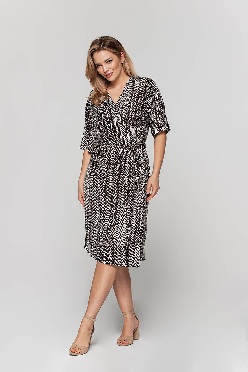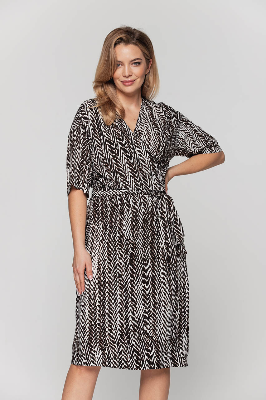 Piękna sukienka we wzory. Najważniejszym jej atutem jest to, iż wykonano ją z wysokogatunkowej, mało mnącej się wiskozy. Przez to jest idealna na upały, bo chroni skórę przed słońcem a jednocześnie pozwala jej w pełni oddychać. Kopertowe wiązanie zapewnia wygodę i świetnie układa sie na każdego typu sylwetce. Sukienka doskonale prezentuje się w codziennych miejskich stylizacjach z loafersami i dużą torbą.