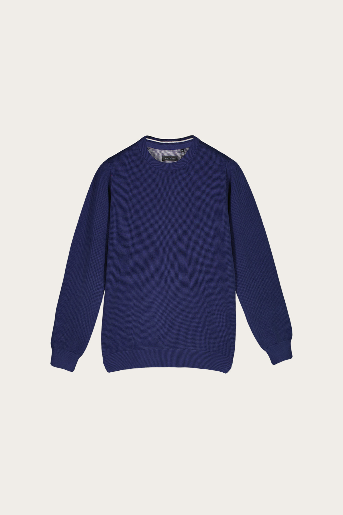 Granatowy sweter uszyty z miękkiej dzianiny bawełnianej ze strukturą. Model o klasycznym fasonie. Posiada ściągacze u dołu i przy rękawach.