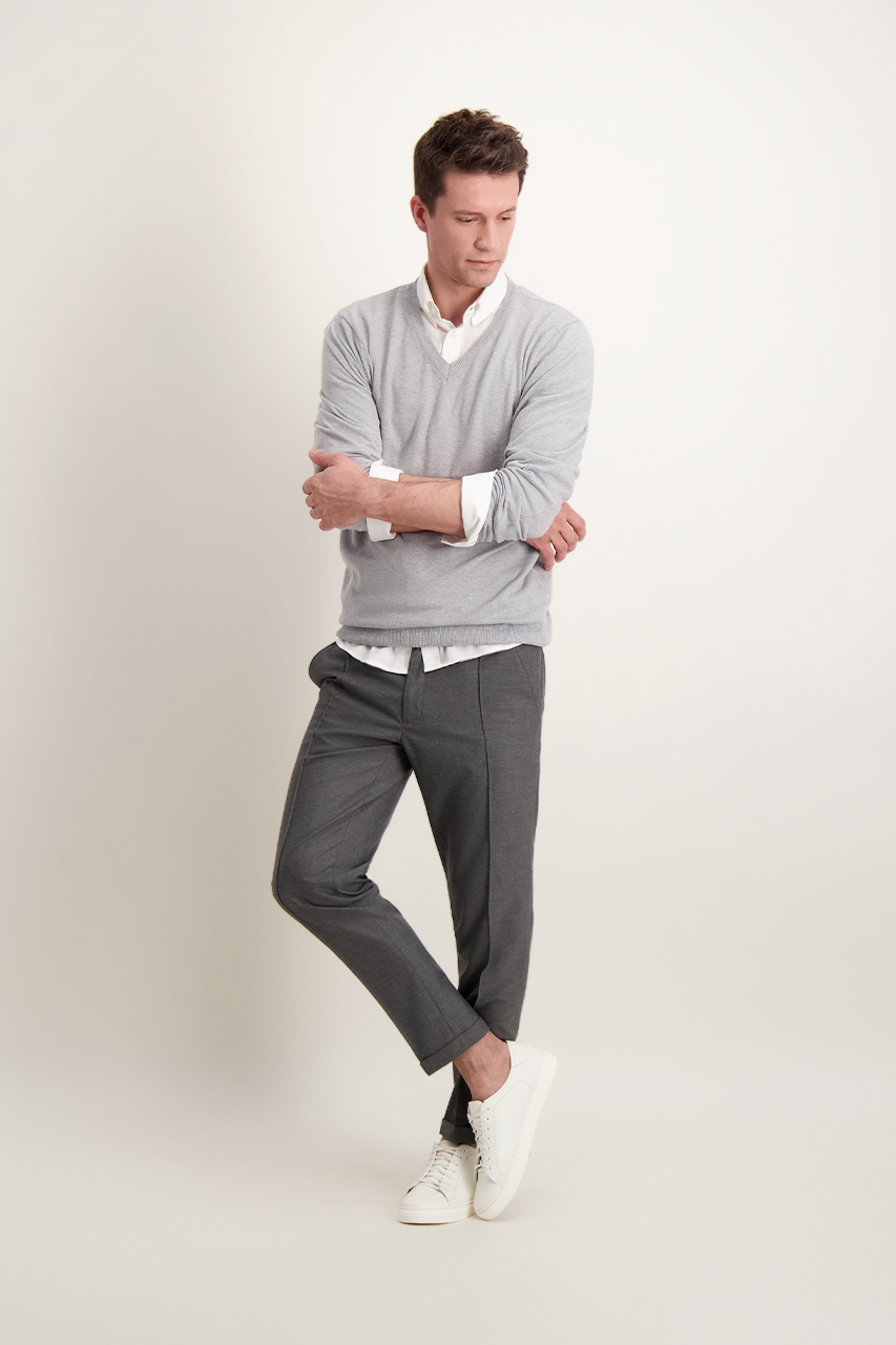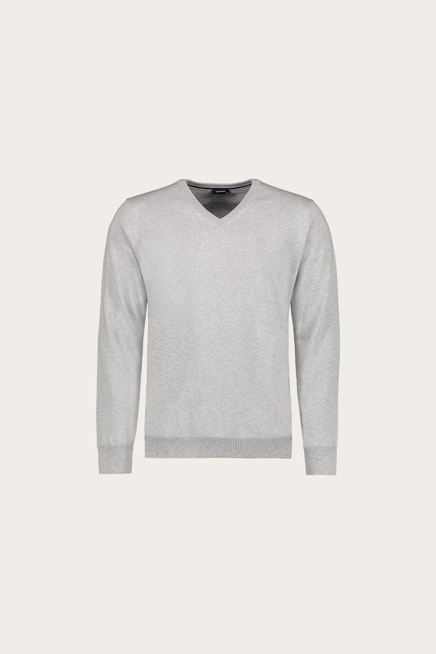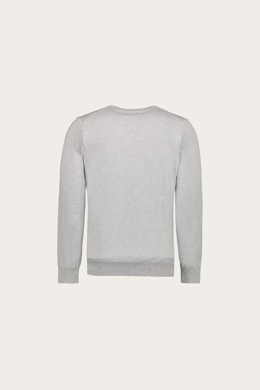 Szary sweter uszyty z miękkiej dzianiny bawełnianej. Model o klasycznym fasonie. Posiada ściągacze u dołu i przy rękawach. Sweter wyprodukowany w Polsce.
