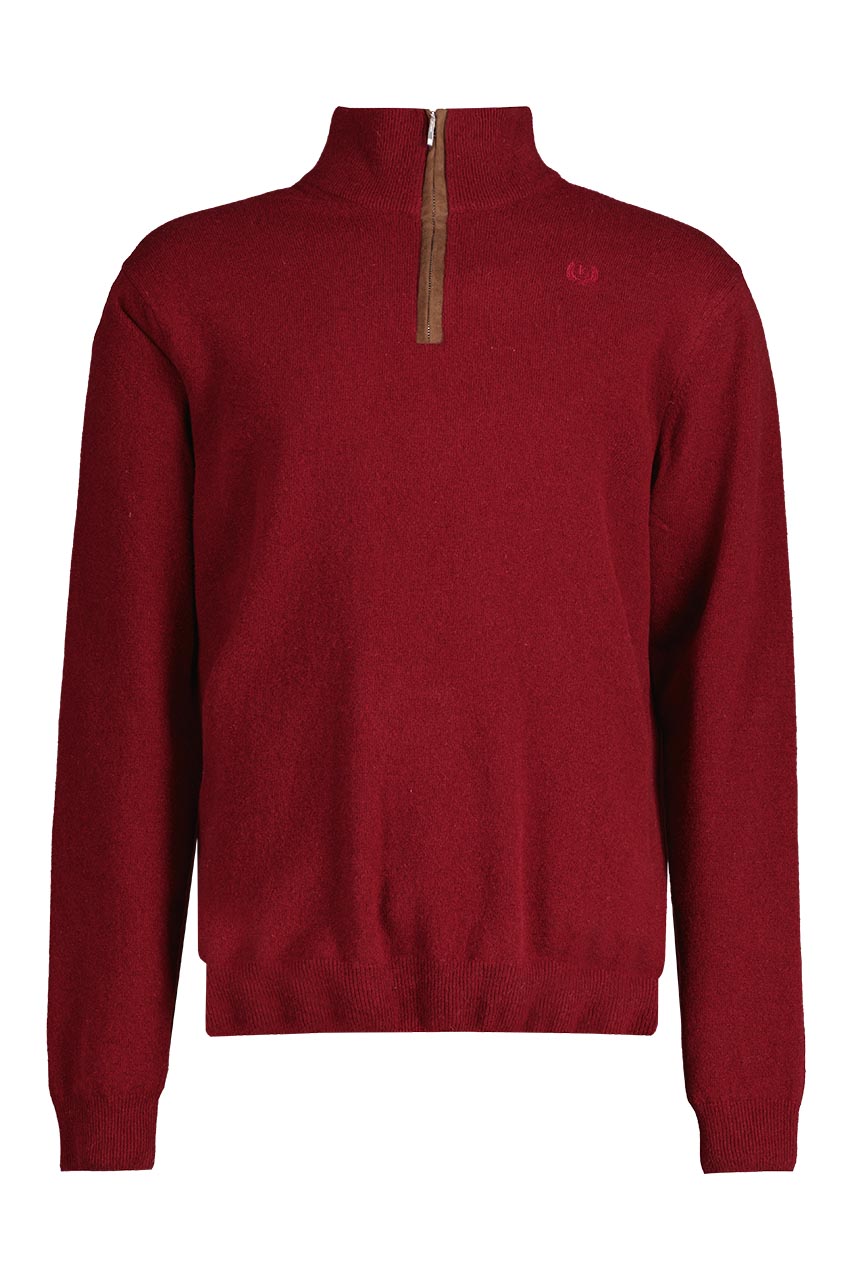 Bordowy sweter męski ze stójką zapinaną na zamek. Model uszyty z przyjemnej i miękkiej dzianiny z dodatkiem wełny.
