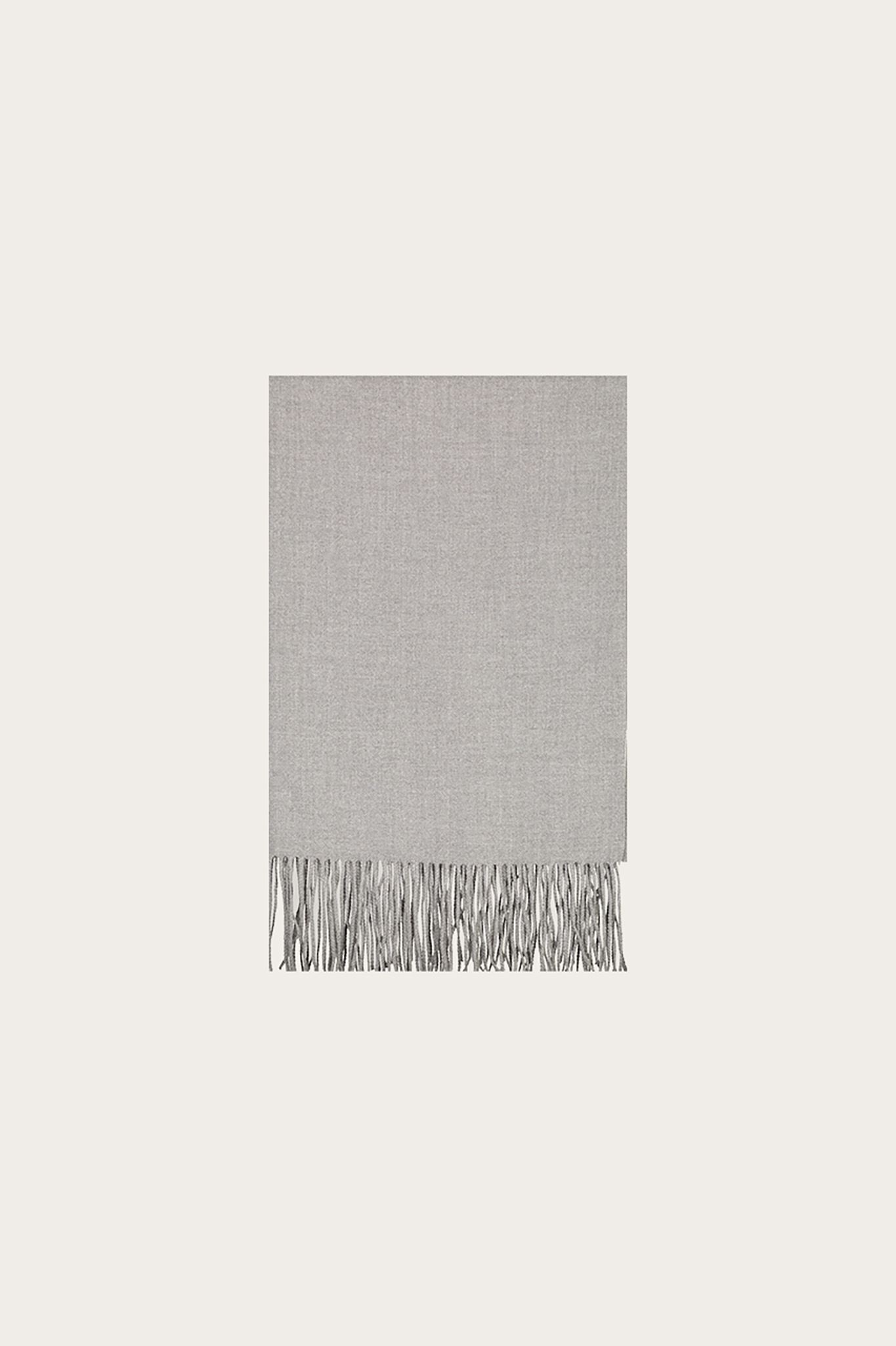 Szal damski w odcieniu szarym. Model o gładkim wzorze, zakończony frędzlami.