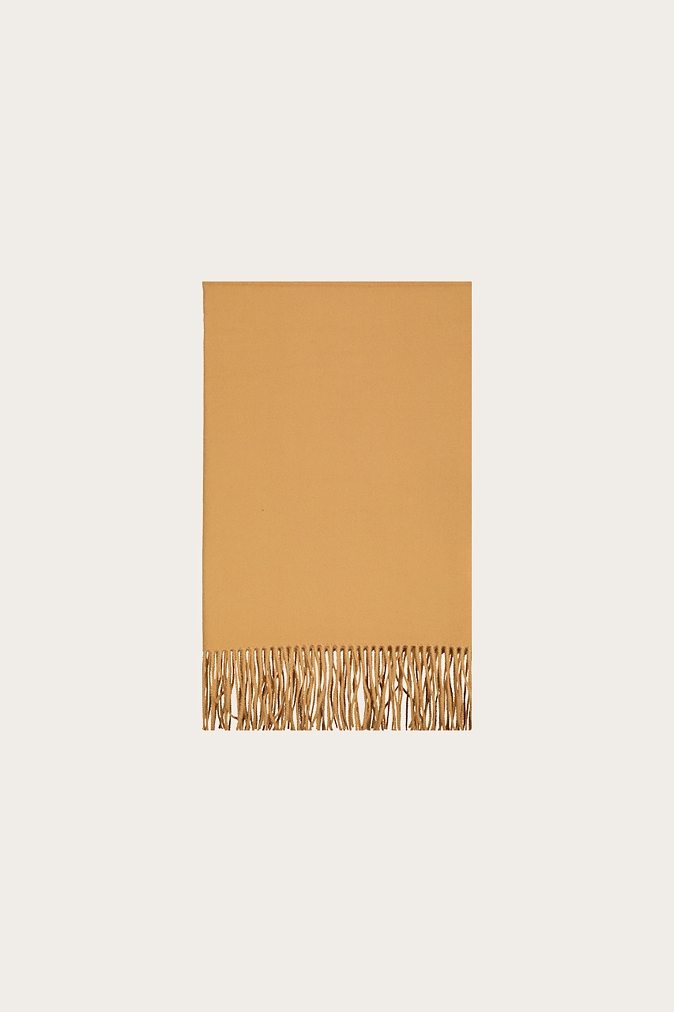 Szal damski w odcieniu camelowym. Model o gładkim wzorze, zakończony frędzlami.
