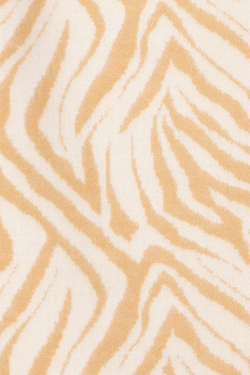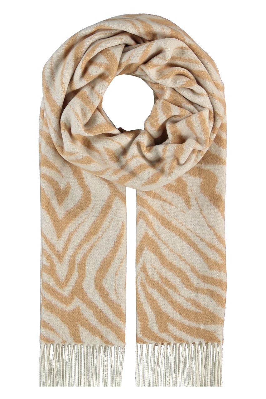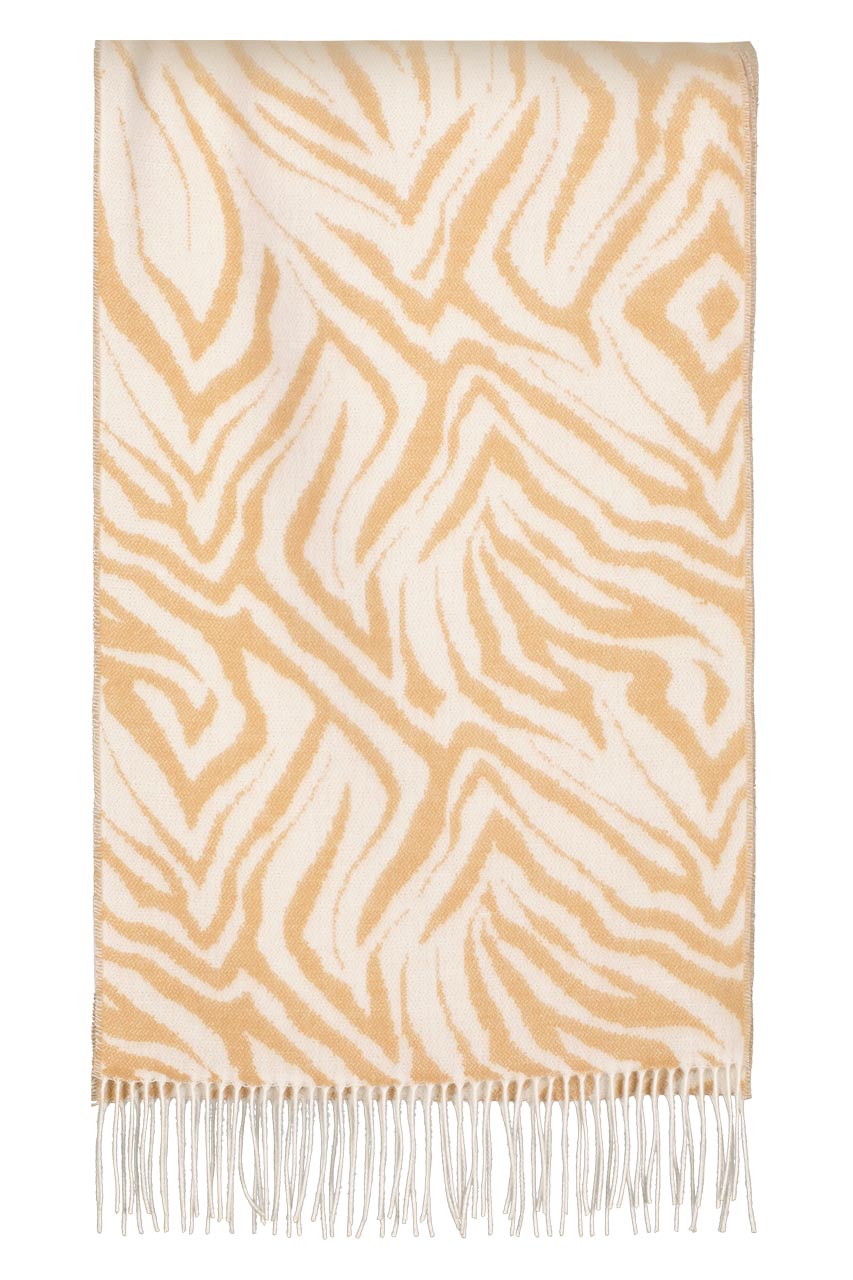 Szal damski w beżowo-kremowy wzór. Model zakończony frędzlami. Uszyty z miękkiej i bardzo przyjemnej w dotyku tkaniny. Szal będzie piękną "kropką nad i" każdej jesienno-zimowej stylizacji. Wymiary modelu to 34 cm x 180 cm.