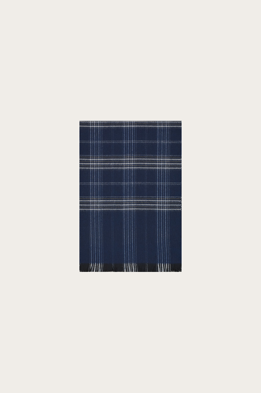Granatowy szal w kratę, uszyty z przyjemnej i miękkiej w dotyku tkaniny.