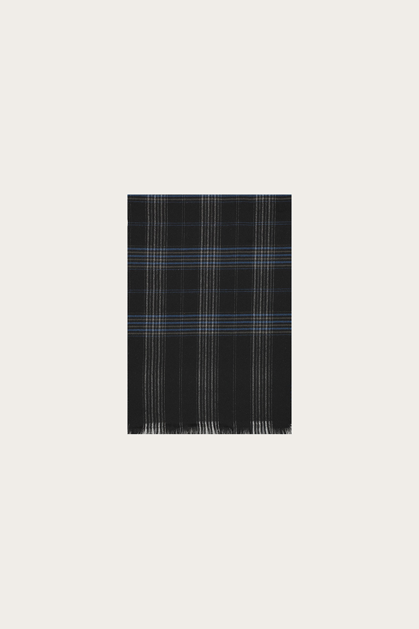 Czarny szal w kratę, uszyty z przyjemnej i miękkiej w dotyku tkaniny.