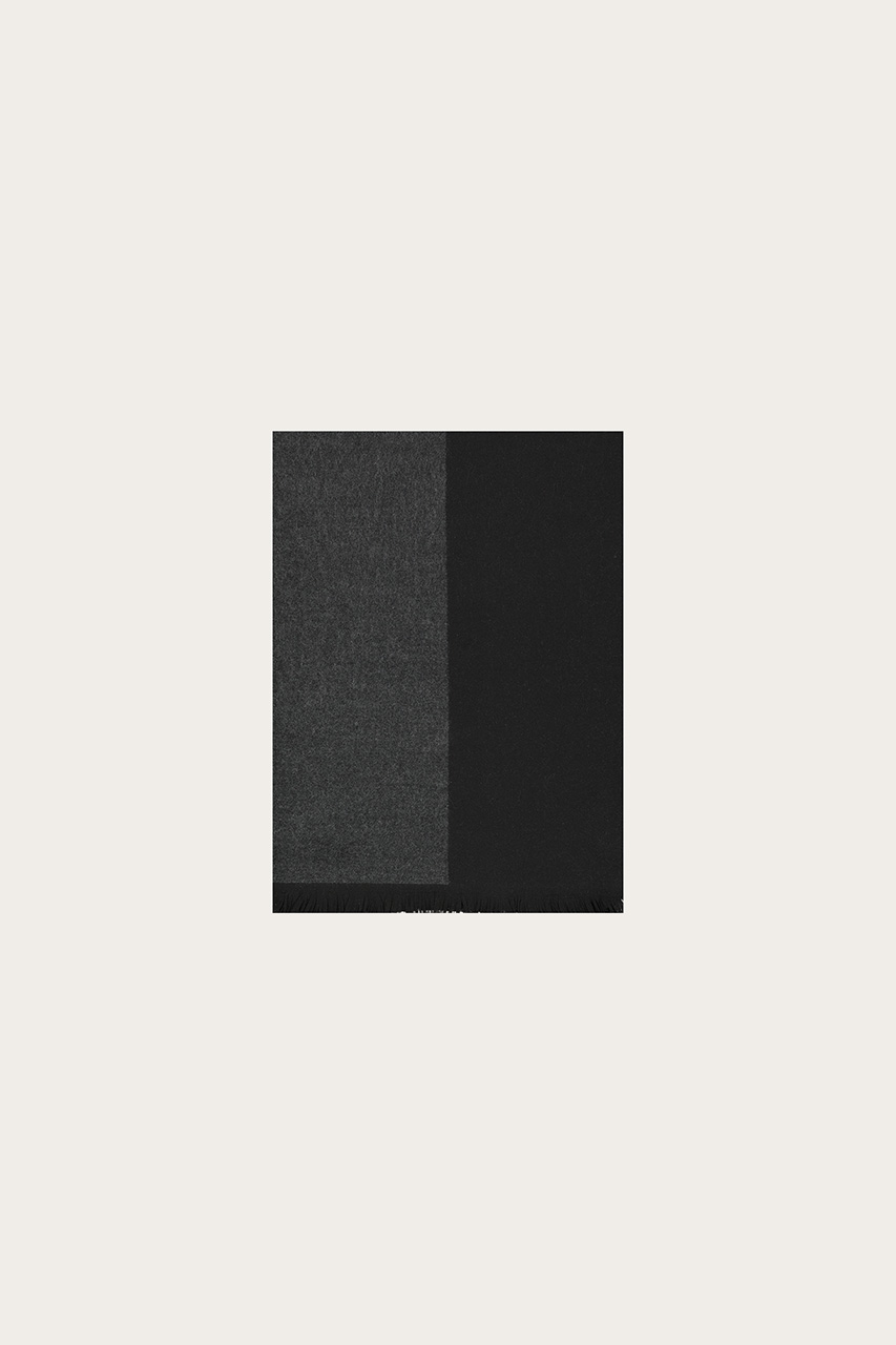 Szal w pasy, utrzymany w odcieniach czerni i grafitu. Uszyty z miękkiej i przyjemnej w dotyku tkaniny.