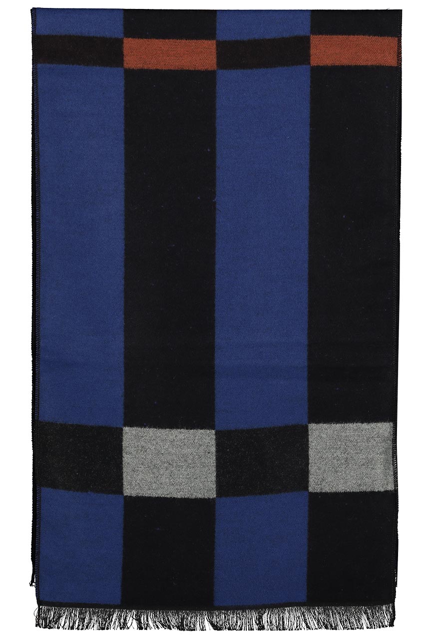 Szal męski w kratę utrzymany w modnych niebieskich i czarnych odcieniach z dodatkiem szarego i jasnego brązu. Piękny model do mniej formalnych zestawień. Wykonany z bardzo przyjemnej w dotyku tkaniny. Świetnie uzupełnienie do zimowego płaszcza w camelowym lub szarym odcieniu.