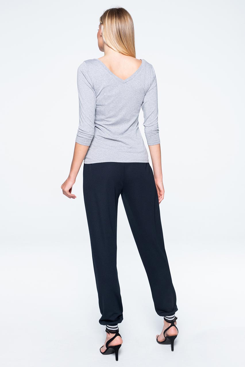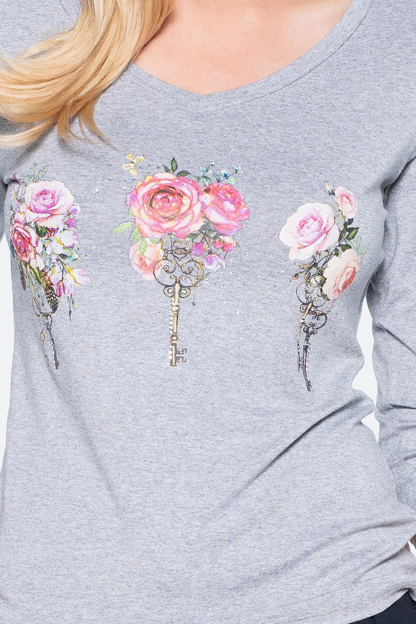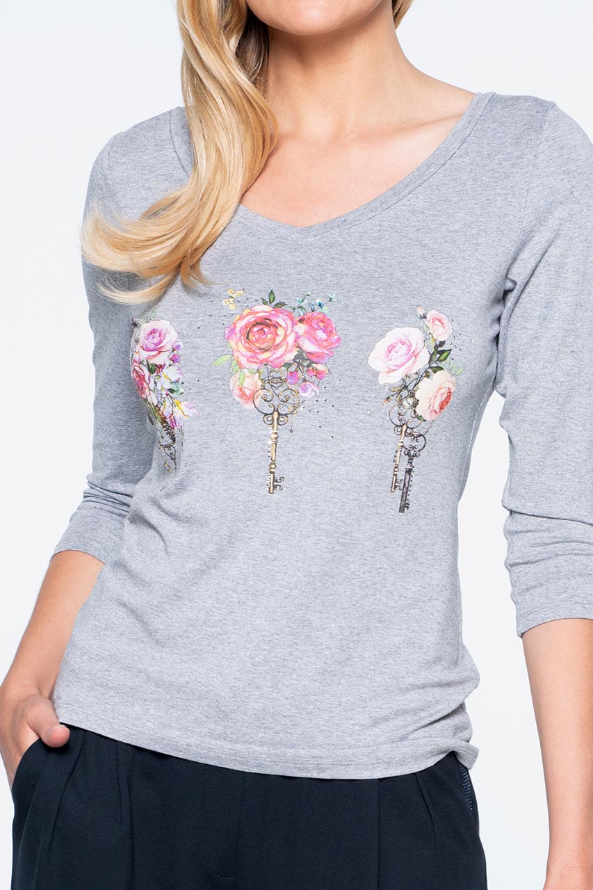 Szara bluzka damska z długim rękawem. Wykonana została z przyjemnej i lekko elastycznej tkaniny, dzięki czemu jest komfortowa w użytkowaniu. Model o dopasowanym fasonie i z modnym dekoltem V-neck, który optycznie wydłuża szyję i wyszczupla sylwetkę. Kobiecy, kolorowy nadruk pięknie urozmaici każdą stylizację. Bluzka świetnie prezentuje się zarówno solo w zestawie z jeansami jak i w luźnej stylizacji z marynarką i chinosami.