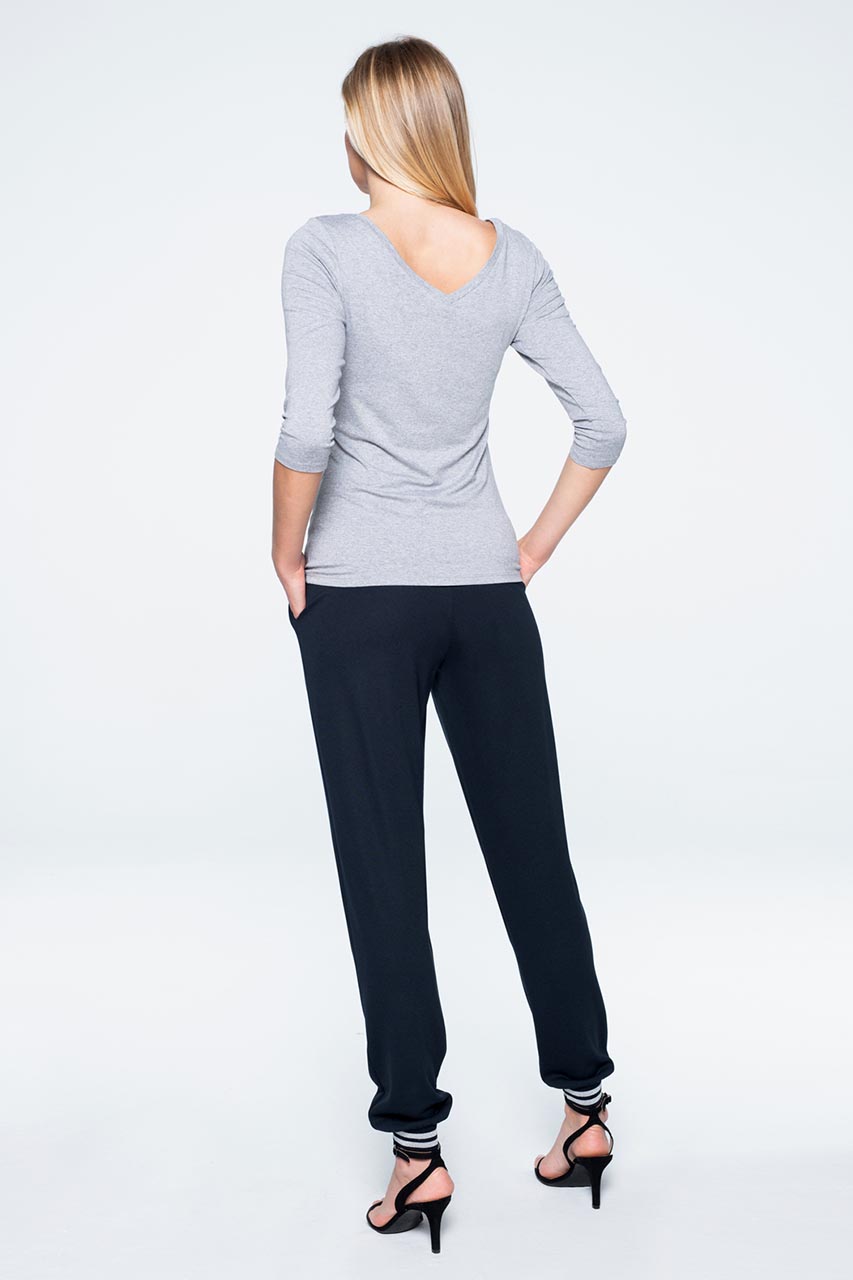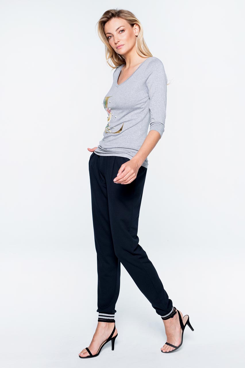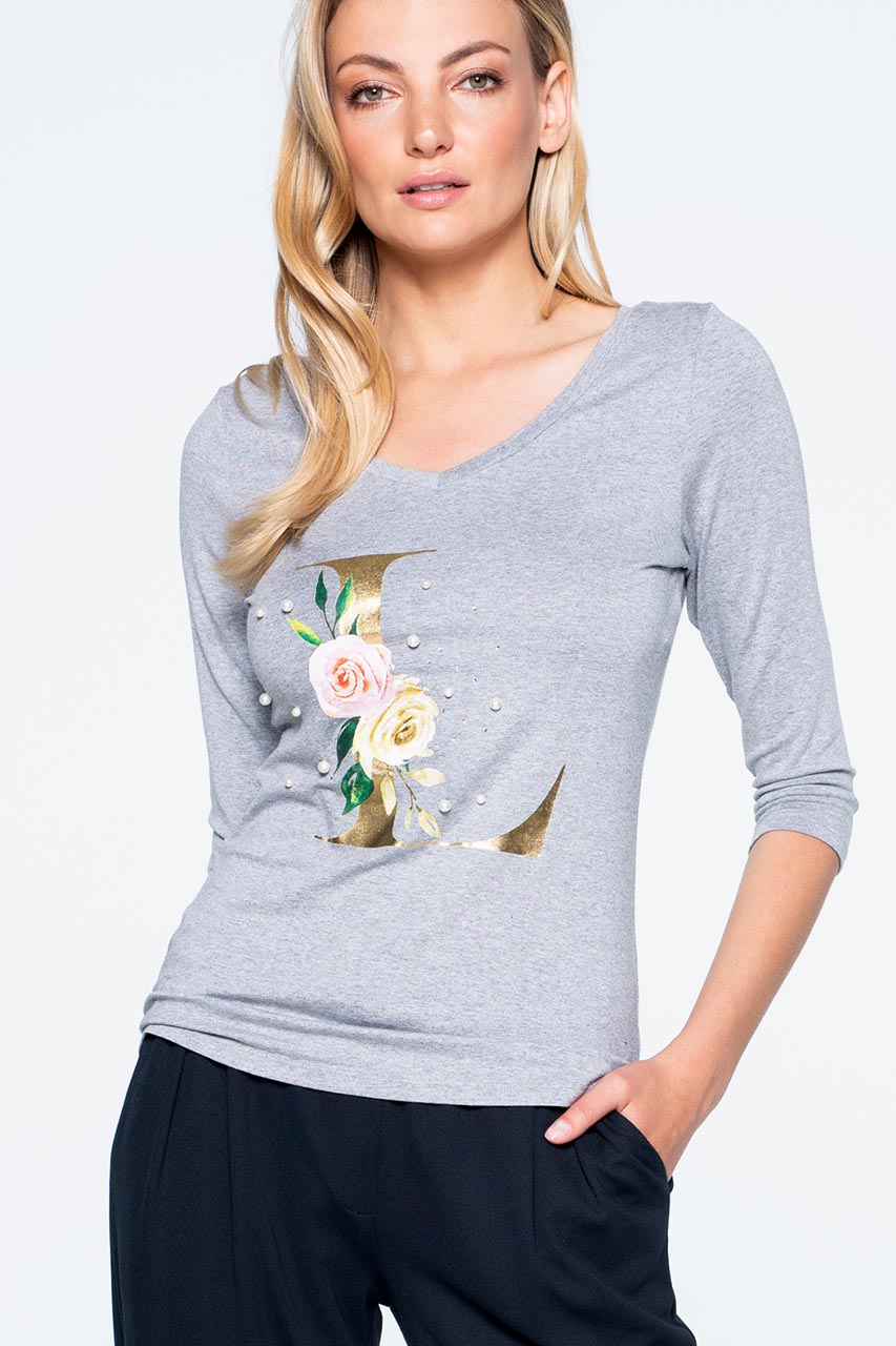 Szara bluzka damska z długim rękawem. Wykonana została z przyjemnej i lekko elastycznej tkaniny, dzięki czemu jest komfortowa w użytkowaniu. Model o dopasowanym fasonie i z modnym dekoltem V-neck, który optycznie wydłuża szyję i wyszczupla sylwetkę. Kobiecy, kolorowy nadruk z ozdobnymi perełkami pięknie urozmaici każdą stylizację. Bluzka świetnie prezentuje się zarówno solo w zestawie z jeansami jak i w luźnej stylizacji z marynarką i chinosami.