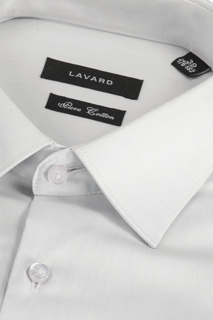 Model z klasycznym kołnierzem i z długim rękawem. Koszula uszyta z bawełnianej tkaniny. Zapinana na perłowe guziki.