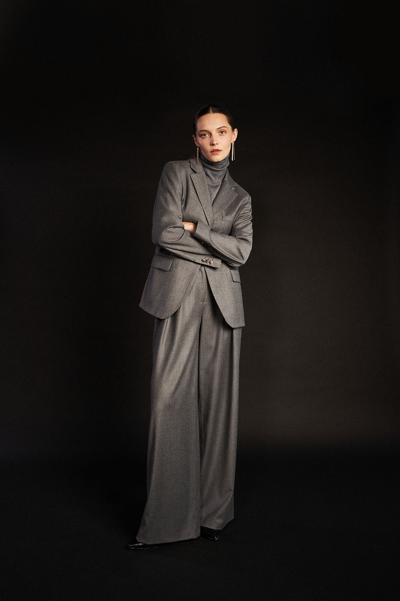 Szare spodnie wykonane ze szlachetnej tkaniny flanelowej z kaszmirem pochodzącej od renomowanego, włoskiego produceta Zignone. Spodnie typu wide leg o szerokich nogawkach z zakładkami. Spodnie z marynarką (86715) z tej samej tkaniny tworzą garnitur.