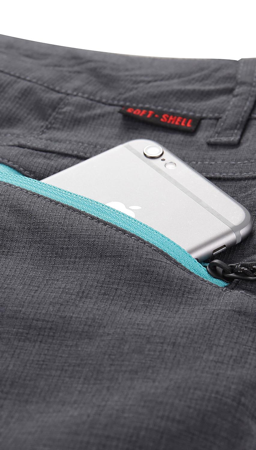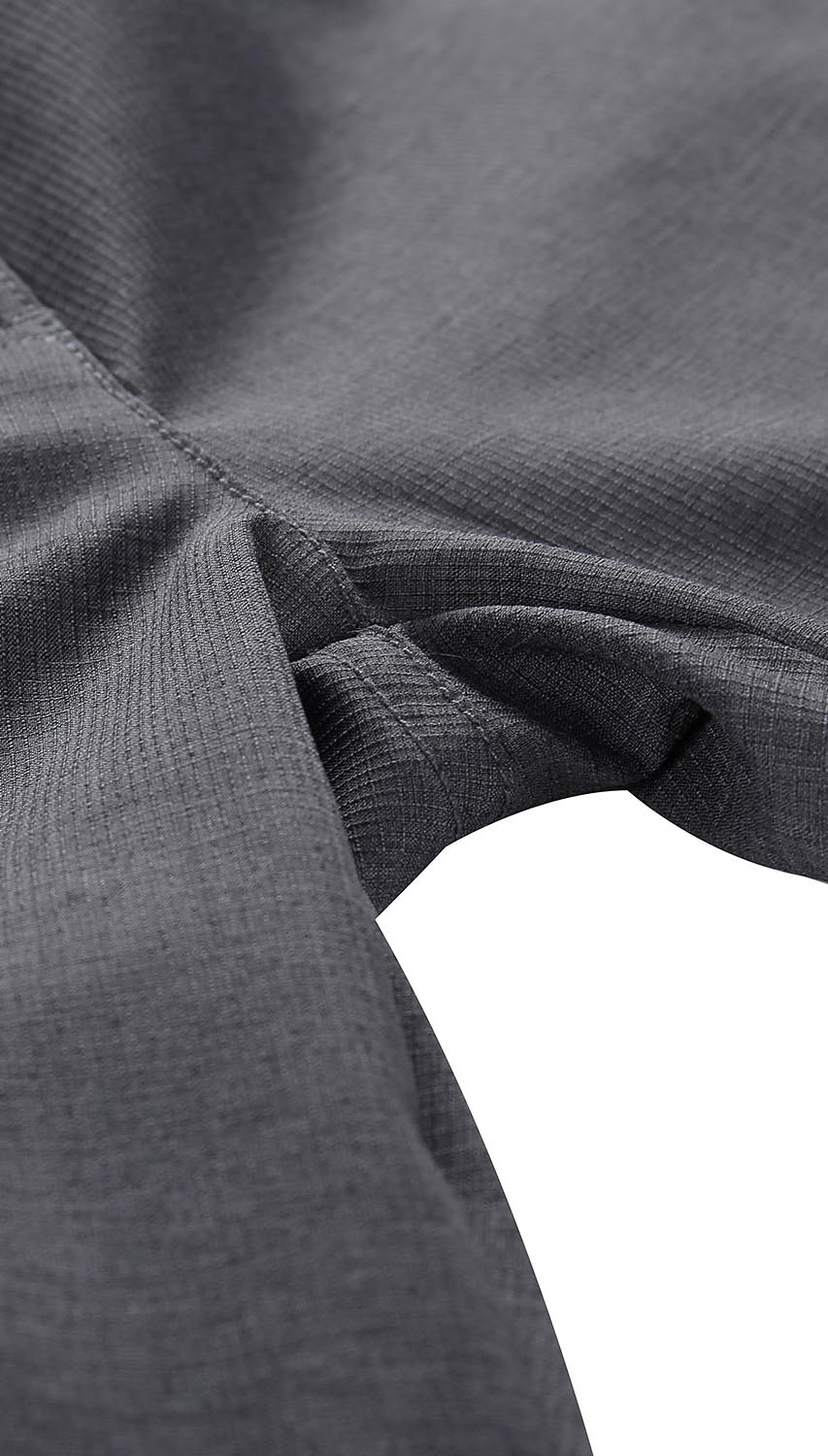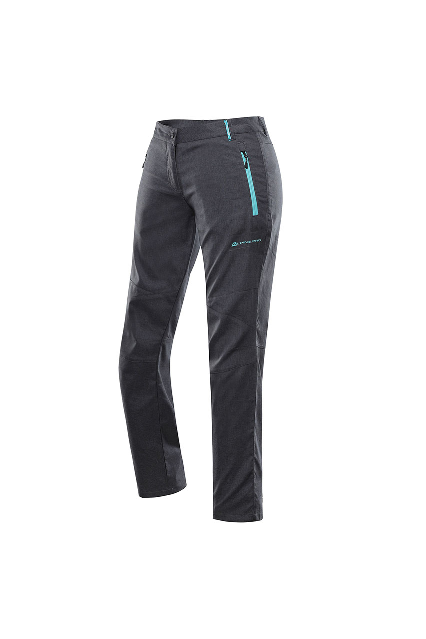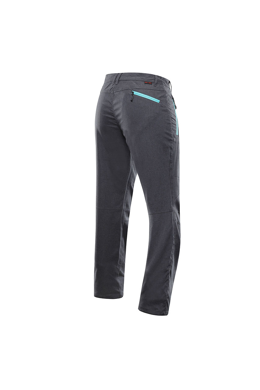 Szare spodnie damskie turystyczne. Wykonane z wodoodpornej, a zarazem szybkoschnącej i oddychającej tkaniny „soft-shell” oraz „cool-dry”. Posiadają niebieskie elementy ozdobne oraz kieszenie zapinane na laminowany zamek. Dzięki tradycyjnym nogawkom z anatomicznym krojem na kolanach spodnie są komfortowe oraz nie krępują ruchów. Sprawdzą się doskonale podczas długich wędrówek górskich oraz na co dzień.