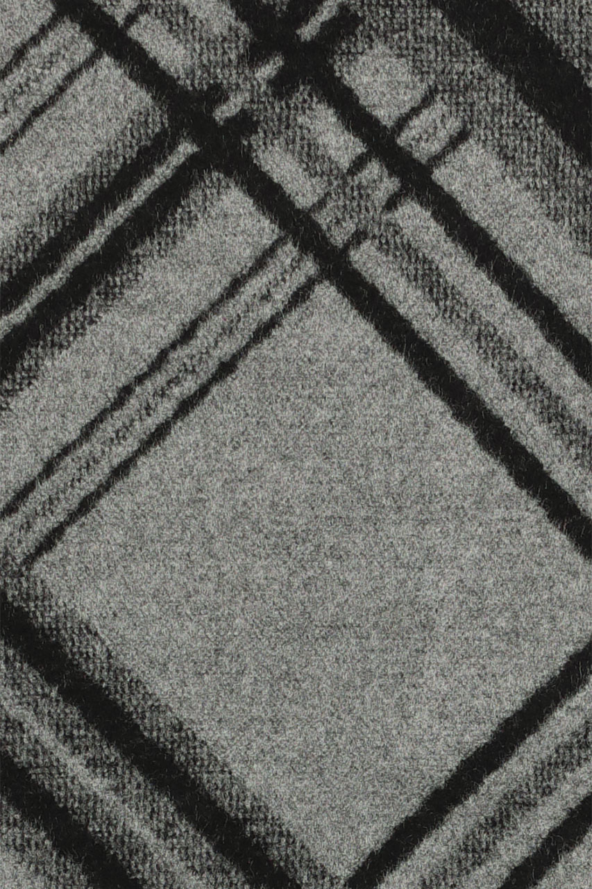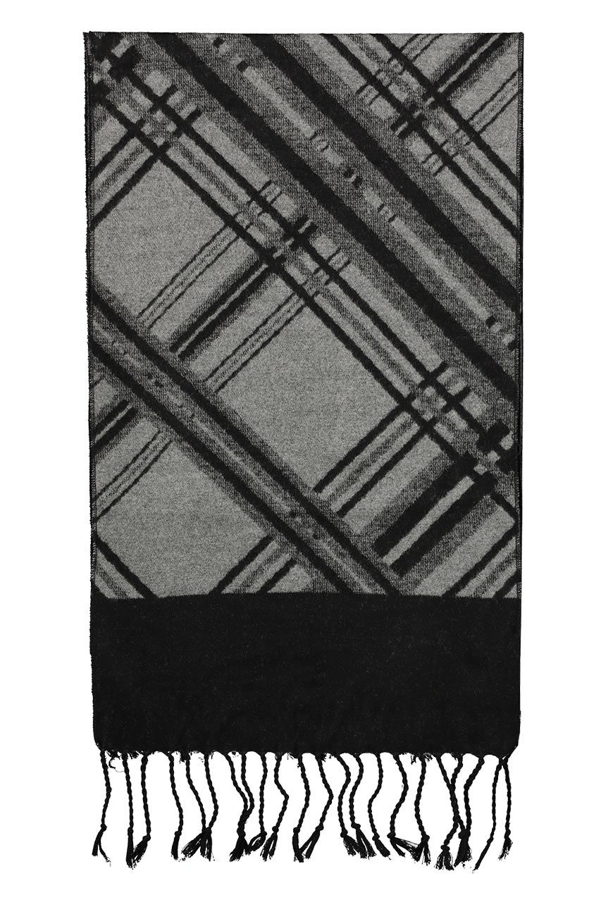 Szary szal męski dwustronny w czarne wzory wykonany z przyjemnej w dotyku tkaniny. Piękny model z frędzlami na końcach. Doskonały do miejskich zestawień z beżowym, szarym czy czarnym płaszczem z wełny.
