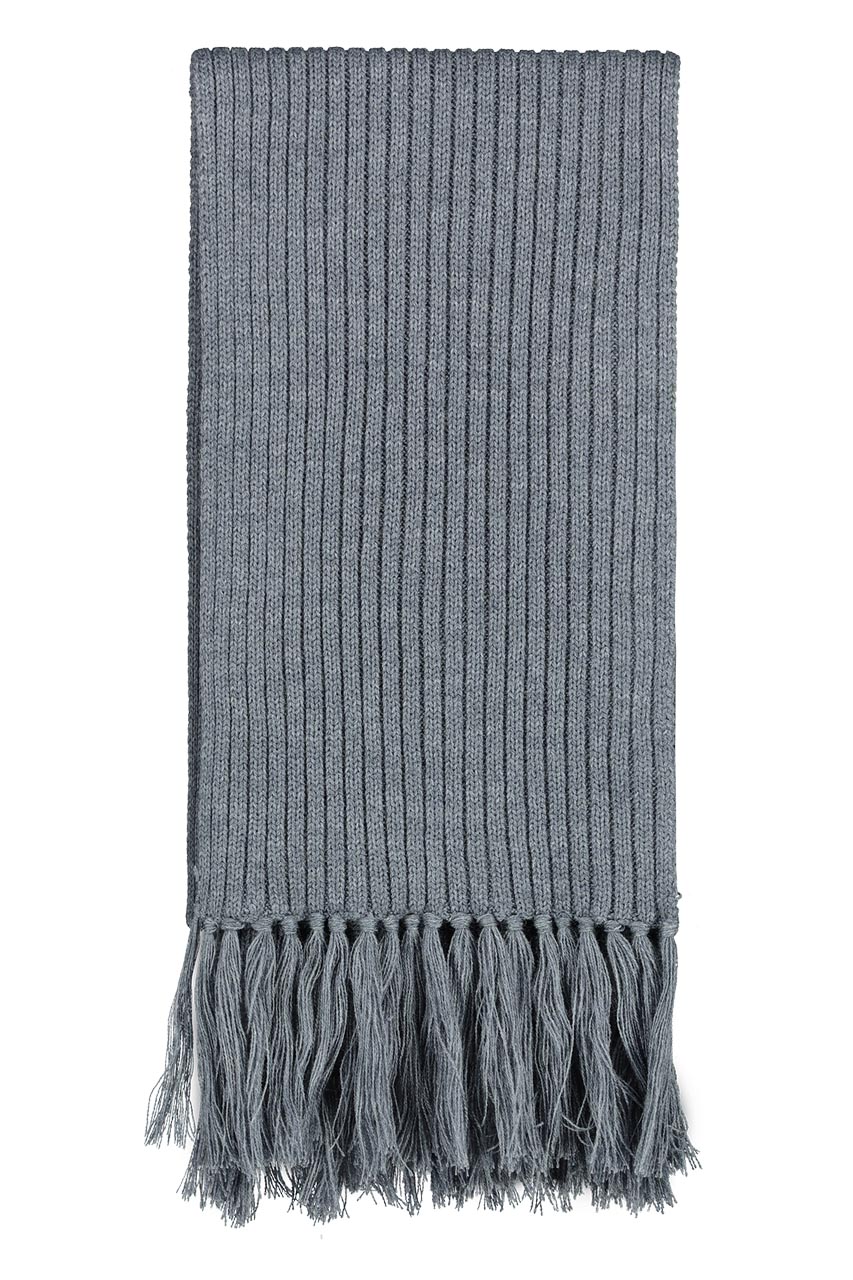 Szary szal z frędzlami wykonany z prążkowanej dzianiny z 50% dodatkiem wełny. Świetny, casualowy model który doskonale urozmaici każdą stylizację. Zapewni cyrkulację powietrza oraz przyjemne ciepło podczas mroźnych dni. Idealny na zimę. Z czapką z tej samej tkaniny 73213 stworzą świetny komplet.