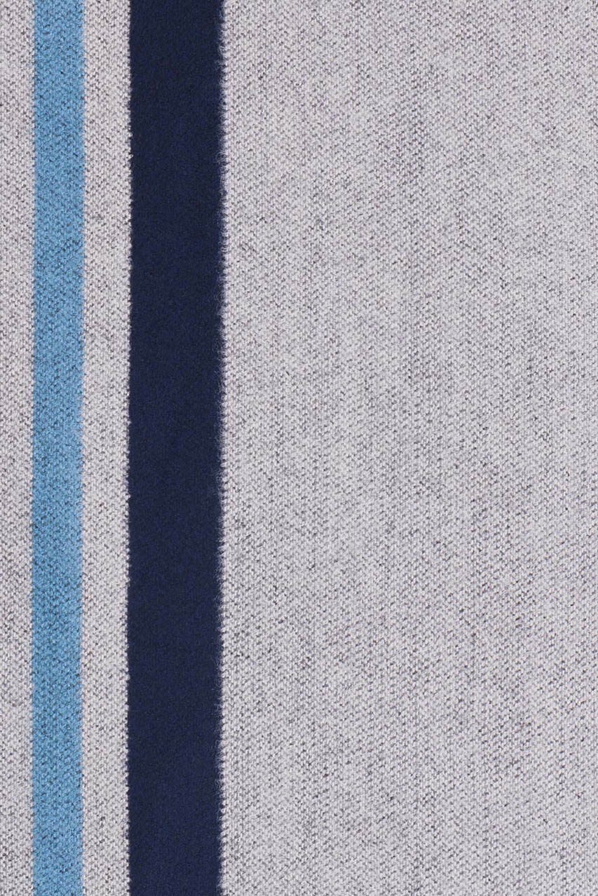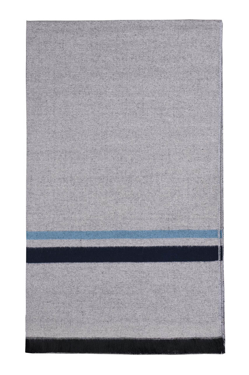 Męski szal utrzymany w szarej tonacji z akcentem w postaci pasów w kolorze niebieskim i granatowym. Wykonany z gładkiego i przyjemnego w dotyku materiału. Model dwustronny. Wymiary szalika to 47x180. Idealne uzupełnienie miejskiej stylizacji w chłodne dni.