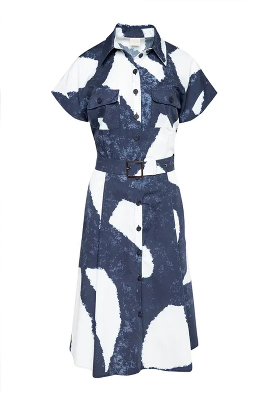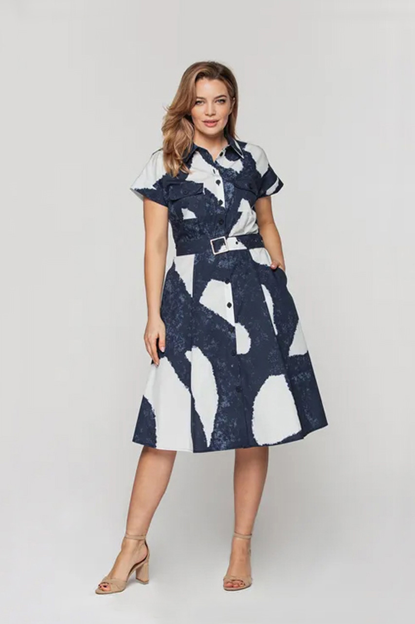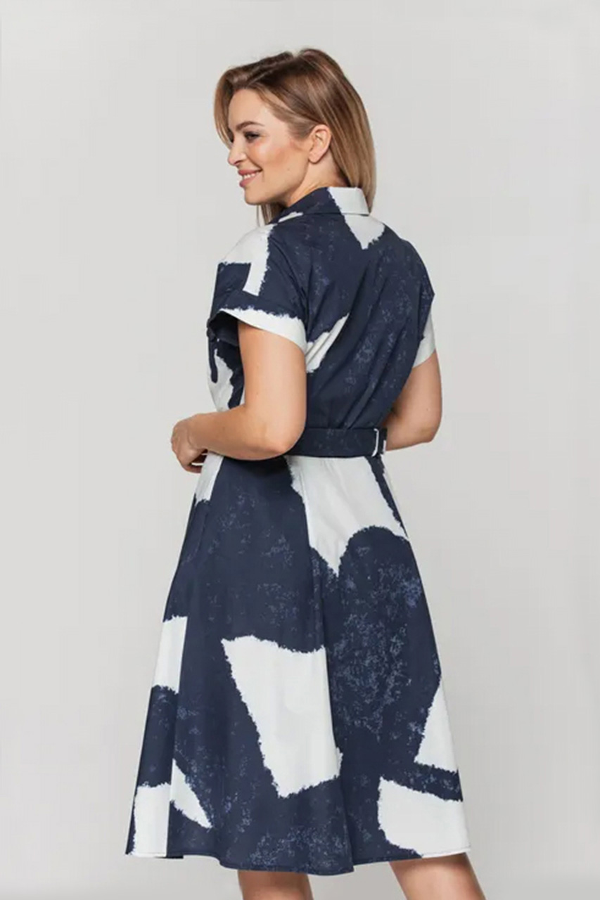 Rozkloszowana szmizjerka damska z paskiem oraz kieszeniami przy dekolcie. Sukienka posiada typowy dla swojego kroju kołnierzyk, krótki rękaw oraz zapięcie na guziki. Tkanina to 100% bawełna w odcieniach niebieskiego oraz bieli. Sukienka sprawdzi się jako ciekawa propozycja do pracy, a także na co dzień. Można ją nosić zarówno w wersji eleganckiej z czółenkami, a także w nieco luźniejszym wydaniu z balerinami oraz kardiganem. W każdym wydaniu doskonale podkreśli kobiecą sylwetkę oraz wyeksponuje wszystkie jej atuty.
