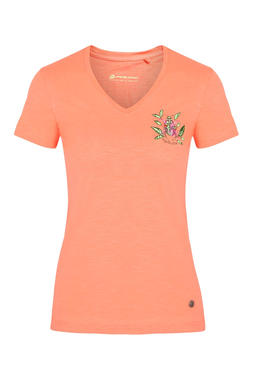 T-shirt damski z pięknym, kolorowym haftem. Model v-neck utrzymany w łososiowym odcieniu. Koszulka została uszyta z lekkiej, bawełnianej tkaniny pozyskiwanej w procesie sprzyjającym naturze. To propozycja, która doskonale spisze się zarówno w codziennych jak i w sportowych stylizacjach.