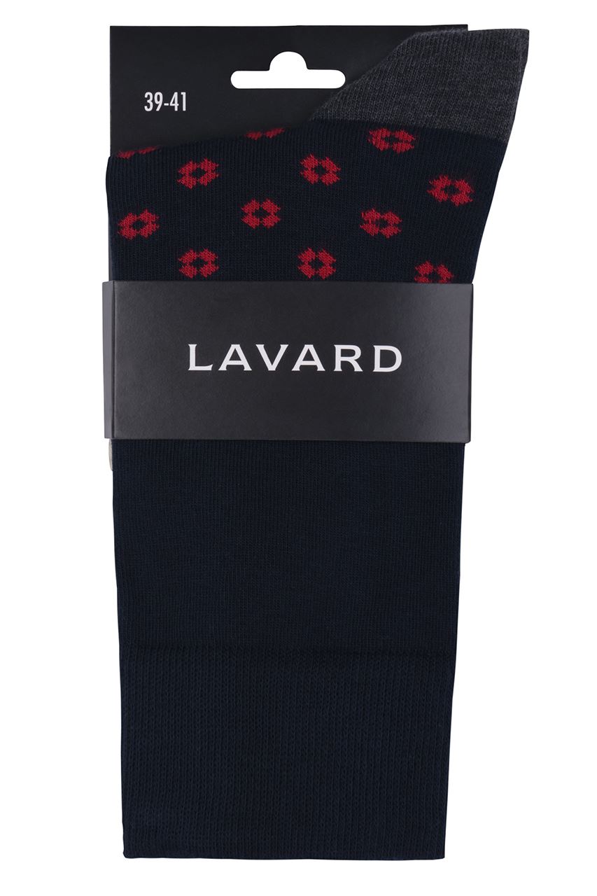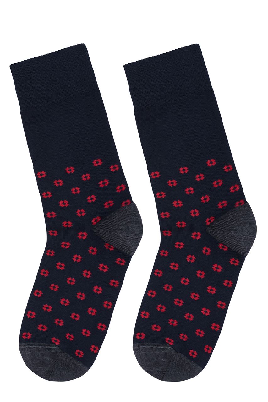 Granatowe skarpety z dodatkiem szarego koloru na elemencie przykrywającym piętę. Model posiada czerwony delikatny kwiatowy wzór. Doda oryginalności każdej formalnej oraz casualowej stylizacji przełamując utarte schematy.