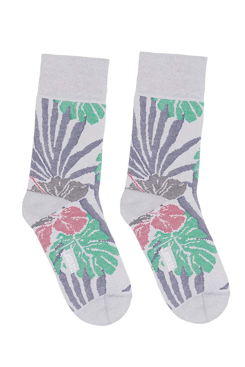 Szare skarpety wkolorowe kwiaty. Wykonane z bawełny. Model z eleganckim logo Lavard na białym tle. Doskonałe dla odważnych mężczyzn, którzy lubią bawić się modą.