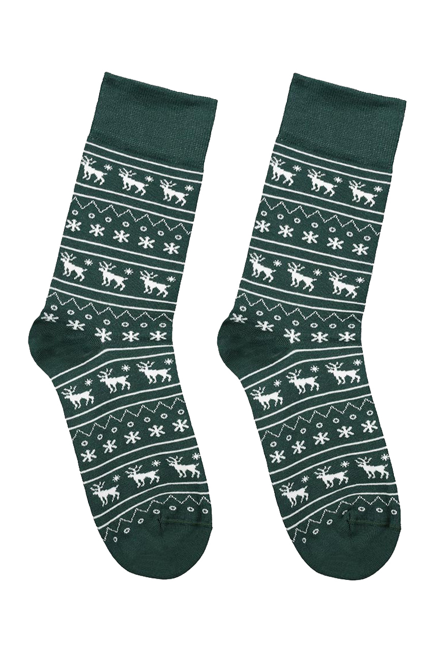 Świąteczne skarpetki dla mężczyzn wykonane z wysokiej jakości bawełny. Świetny model utrzymany w zielonej oraz białej kolorystyce. Motywy reniferów i śnieżynek dodają oryginalnego charakteru. Takie skarpety pozwalają podkreślić charakter całej stylizacji. Przypadną do gustu indywidualistom.