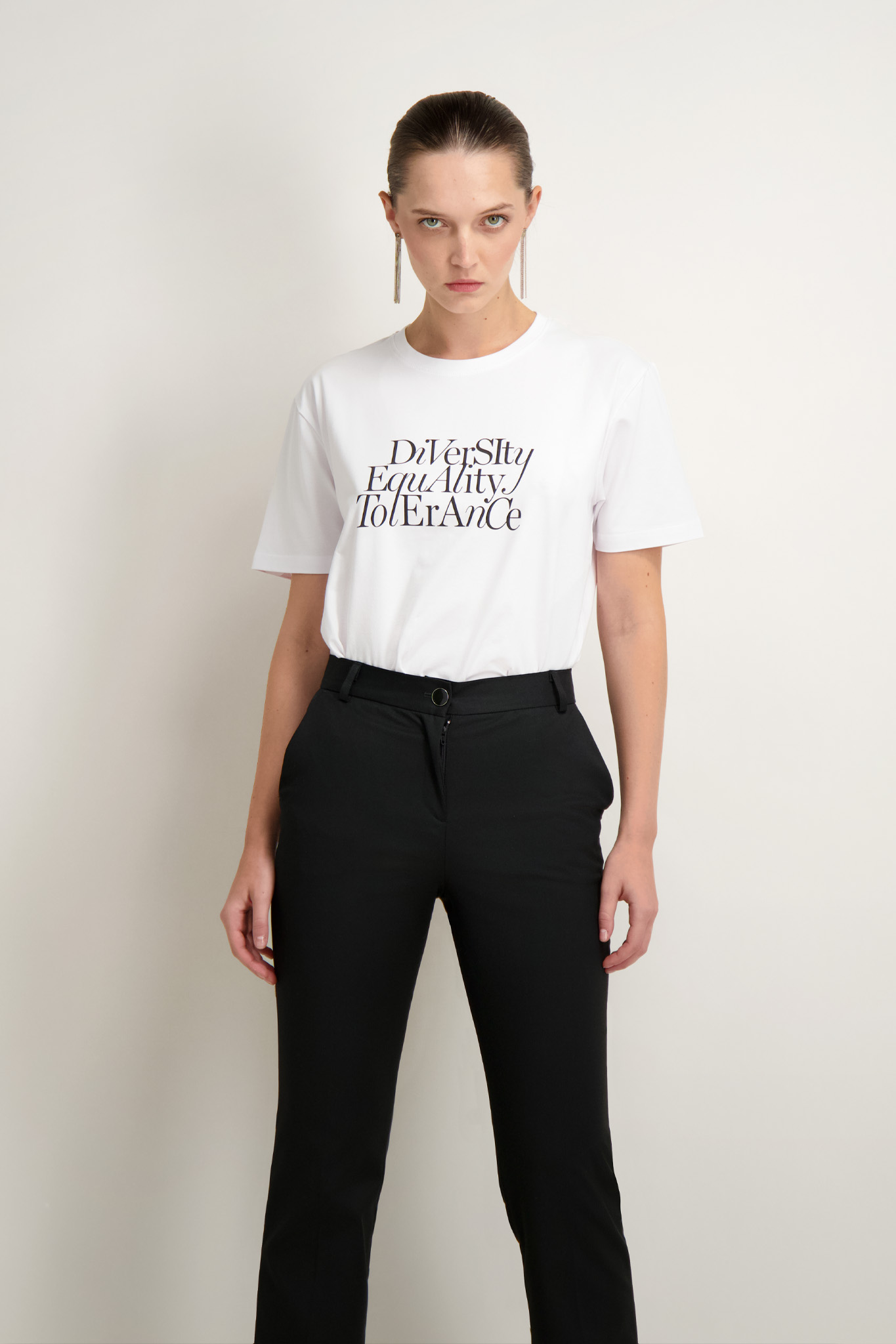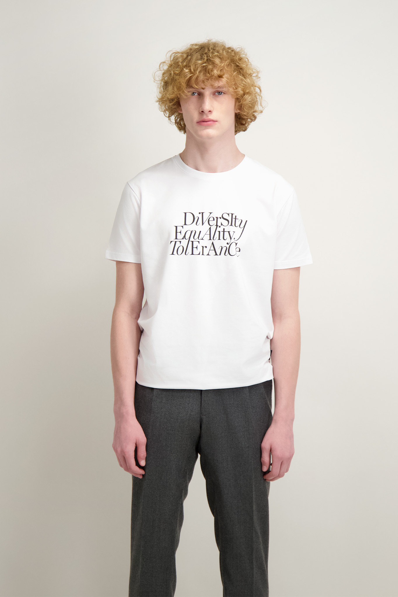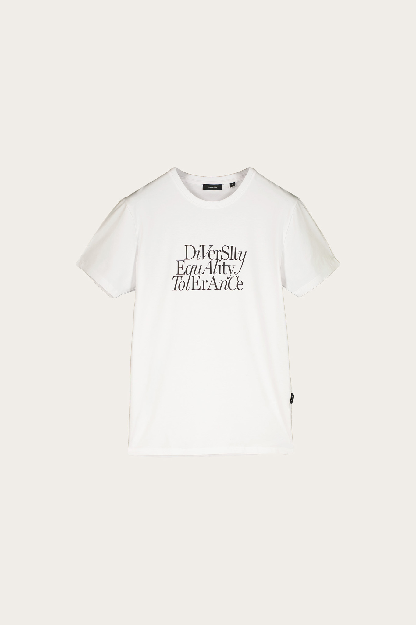 Biały t-shirt uszyty z gładkiej, elastycznej bawełny z nadrukiem. Model o klasycznym fasonie.