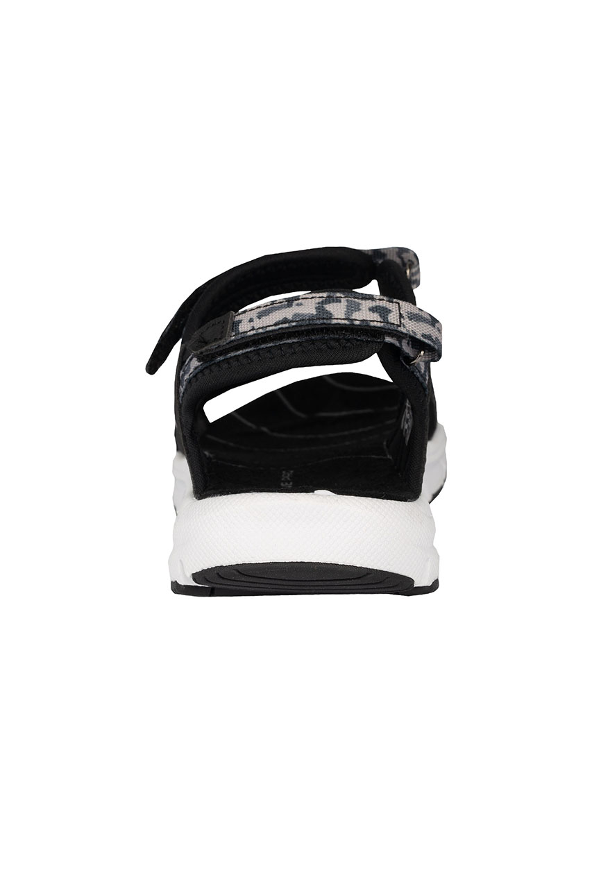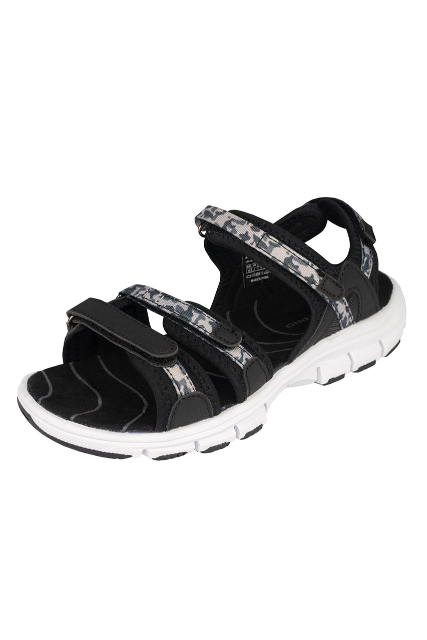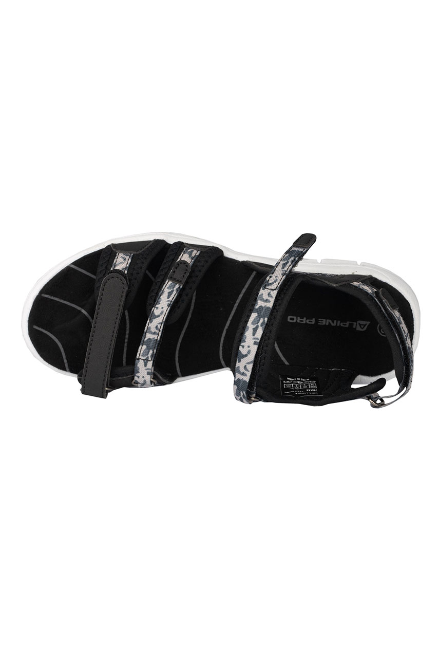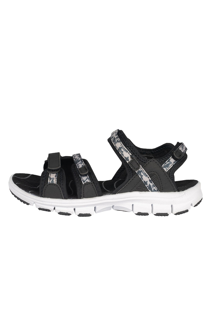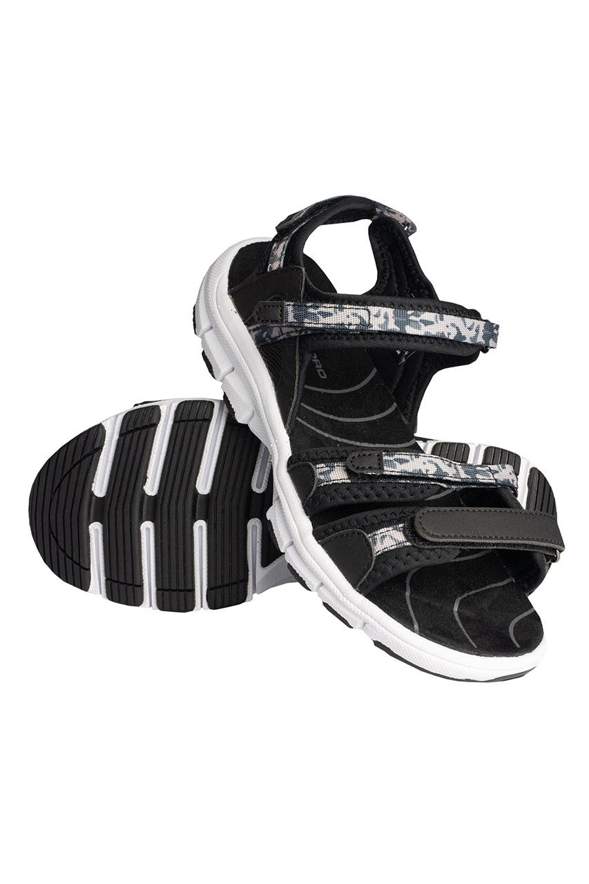 Turystyczne sandały damskie z regulowanymi zapięciami w odcieniach czerni i bieli. Posiadają lekką i wytrzymałą podeszwę, która jest odporna na ścieranie oraz amortyzuje ruchy. Paski są regulowane w czterech miejscach, co ułatwia idealne dopasowanie butów do stopy. Buty posiadają wyprofilowaną wkładkę z przyjemnego w dotyku materiału. To komfortowa propozycja na aktywne spacery, wędrówki turystyczne, a także na co dzień.