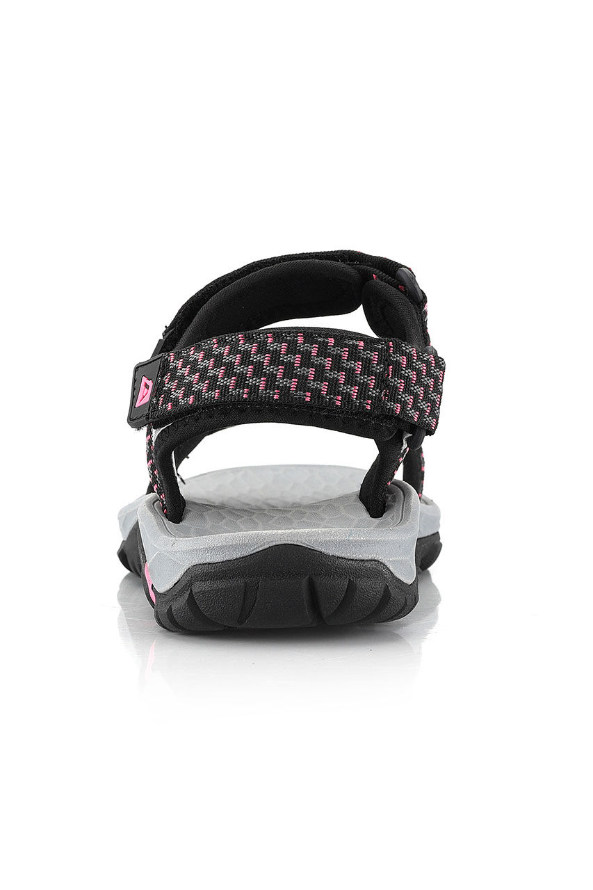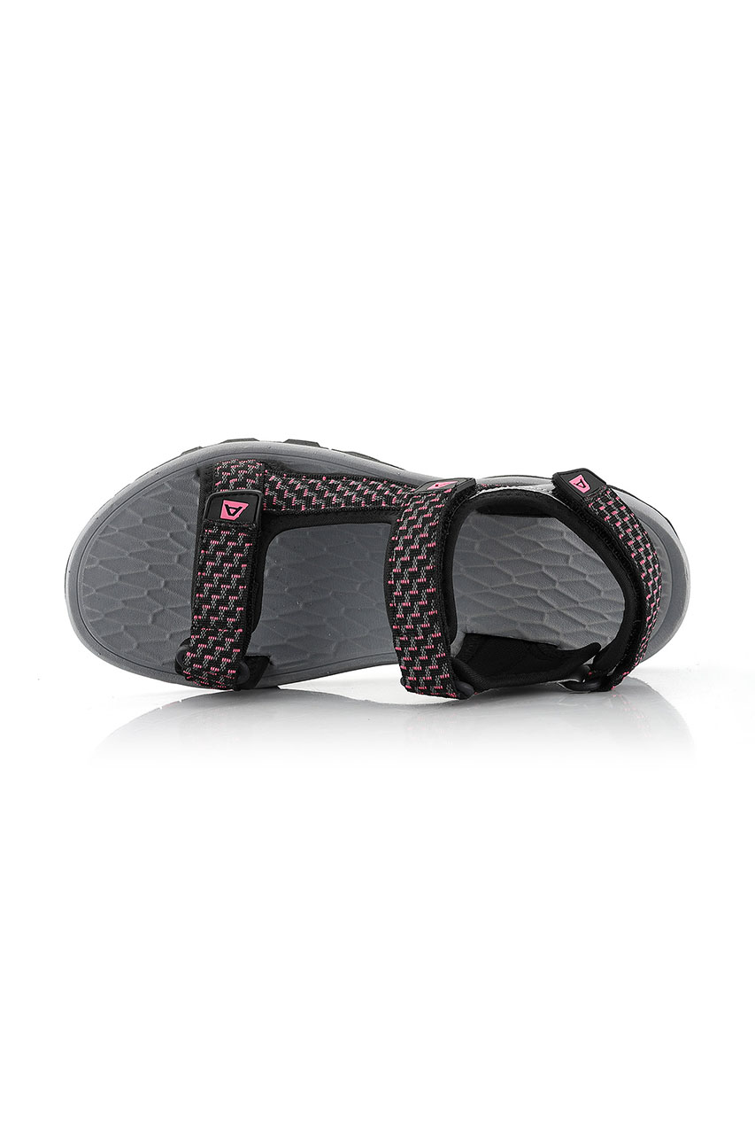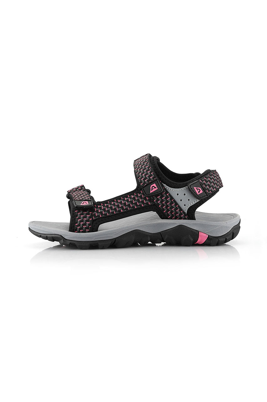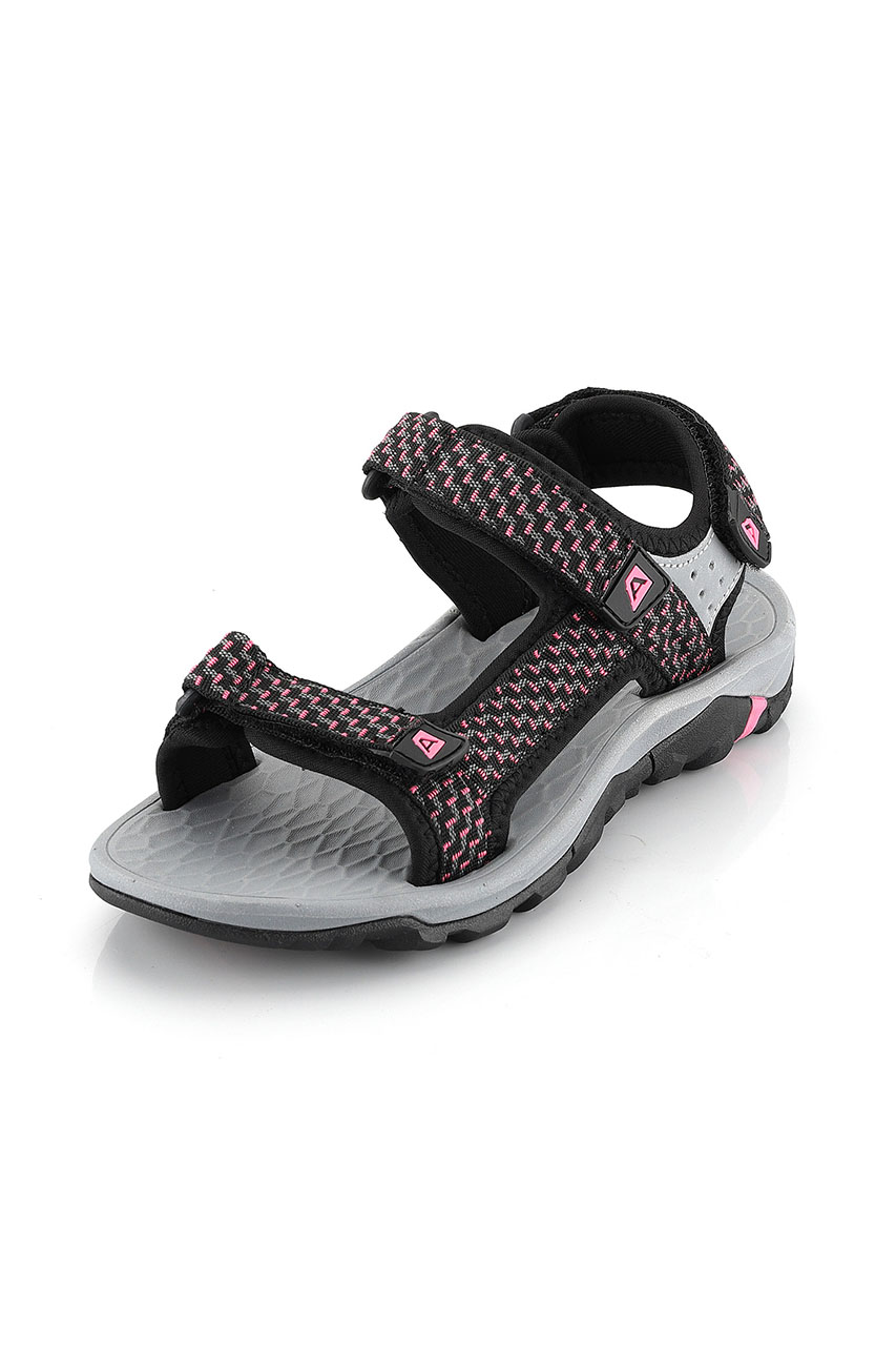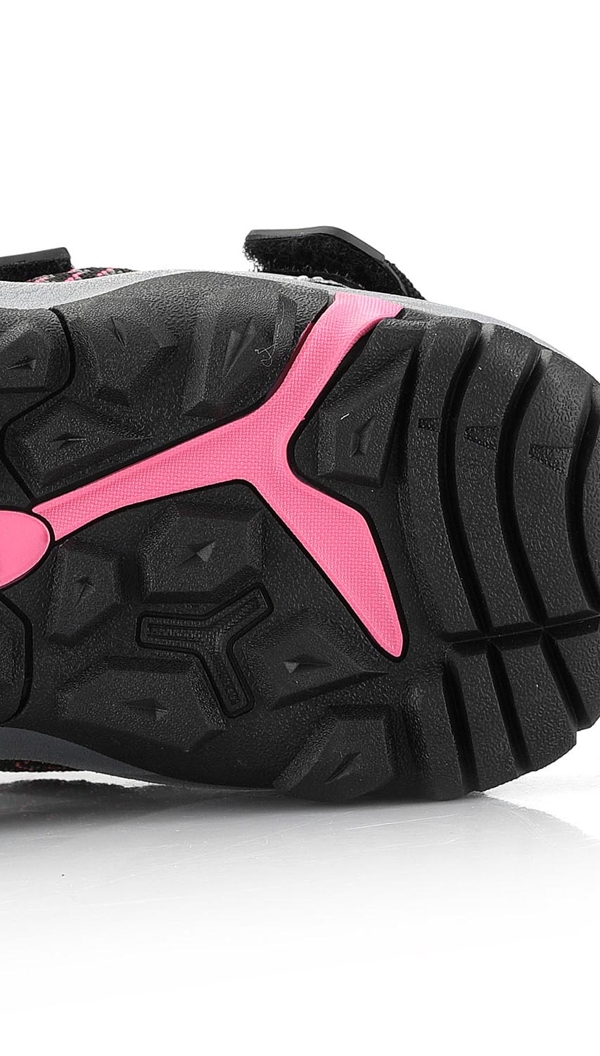 Turystyczne sandały damskie z regulowanymi zapięciami w odcieniach czerni i różu. Posiadają lekką i wytrzymałą podeszwę, która jest odporna na ścieranie oraz amortyzuje ruchy. Paski są regulowane w trzech miejscach, co ułatwia idealne dopasowanie butów do stopy. Istotne jest, że paski są niedzielone co uniemożliwia ich wyrwanie lub inne uszkodzenie. To komfortowa propozycja na aktywne spacery, wędrówki turystyczne, a także na co dzień.