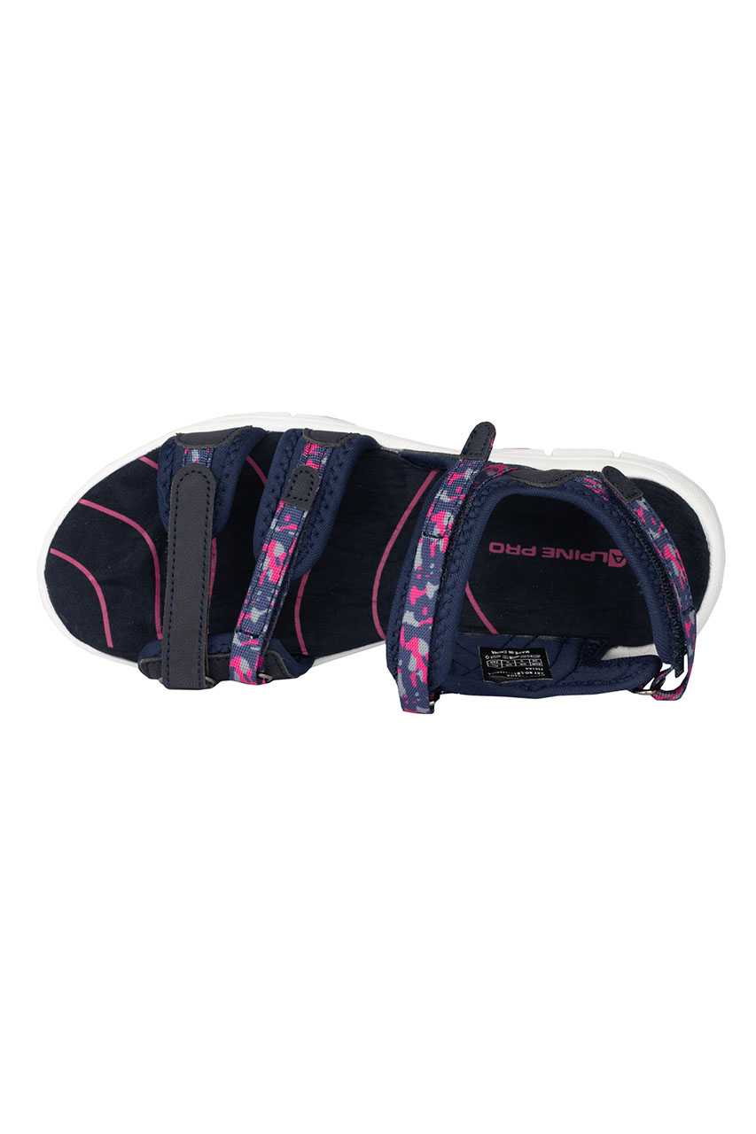 Turystyczne sandały damskie z regulowanymi zapięciami w odcieniach granatu i różu. Posiadają lekką i wytrzymałą podeszwę, która jest odporna na ścieranie oraz amortyzuje ruchy. Paski są regulowane w czterech miejscach, co ułatwia idealne dopasowanie butów do stopy. Buty posiadają wyprofilowaną wkładkę z przyjemnego w dotyku materiału. To komfortowa propozycja na aktywne spacery, wędrówki turystyczne, a także na co dzień.