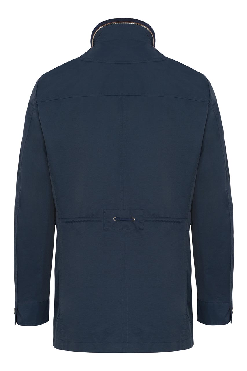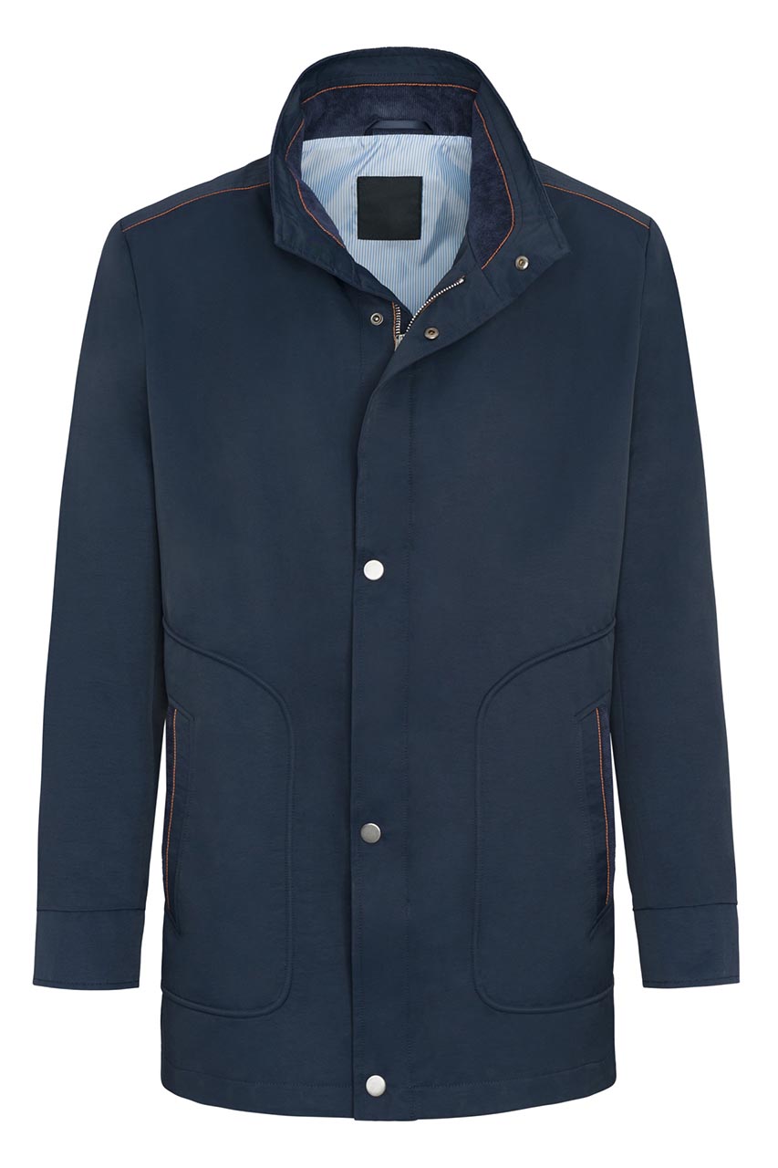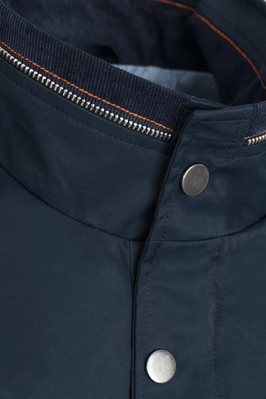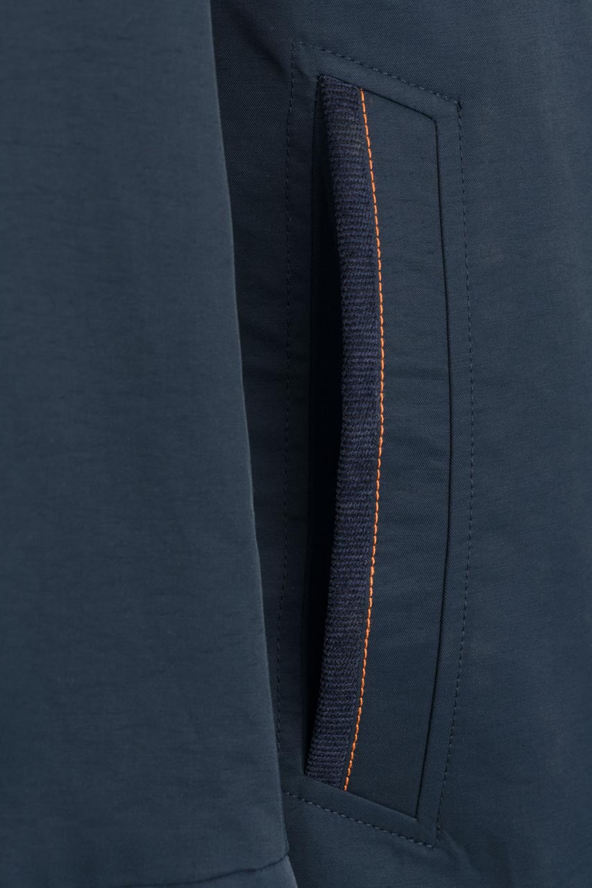 Kurtka męska z regulacją w pasie w granatowym odcieniu. Przedłużony model zapinany na zamek i napy. Posiada dwie cięte, praktyczne kieszenie. Pomarańczowy ozdobny akcent w postaci przeszyć na ramionach, przy kołnierzu i kieszeniach. Świetna propozycja do casualowych i półformalnych stylizacji.
