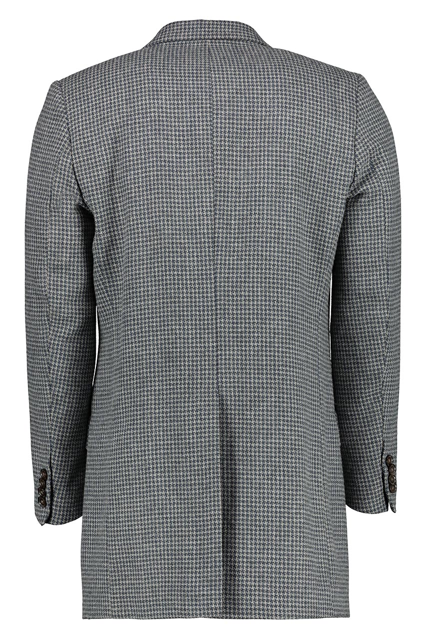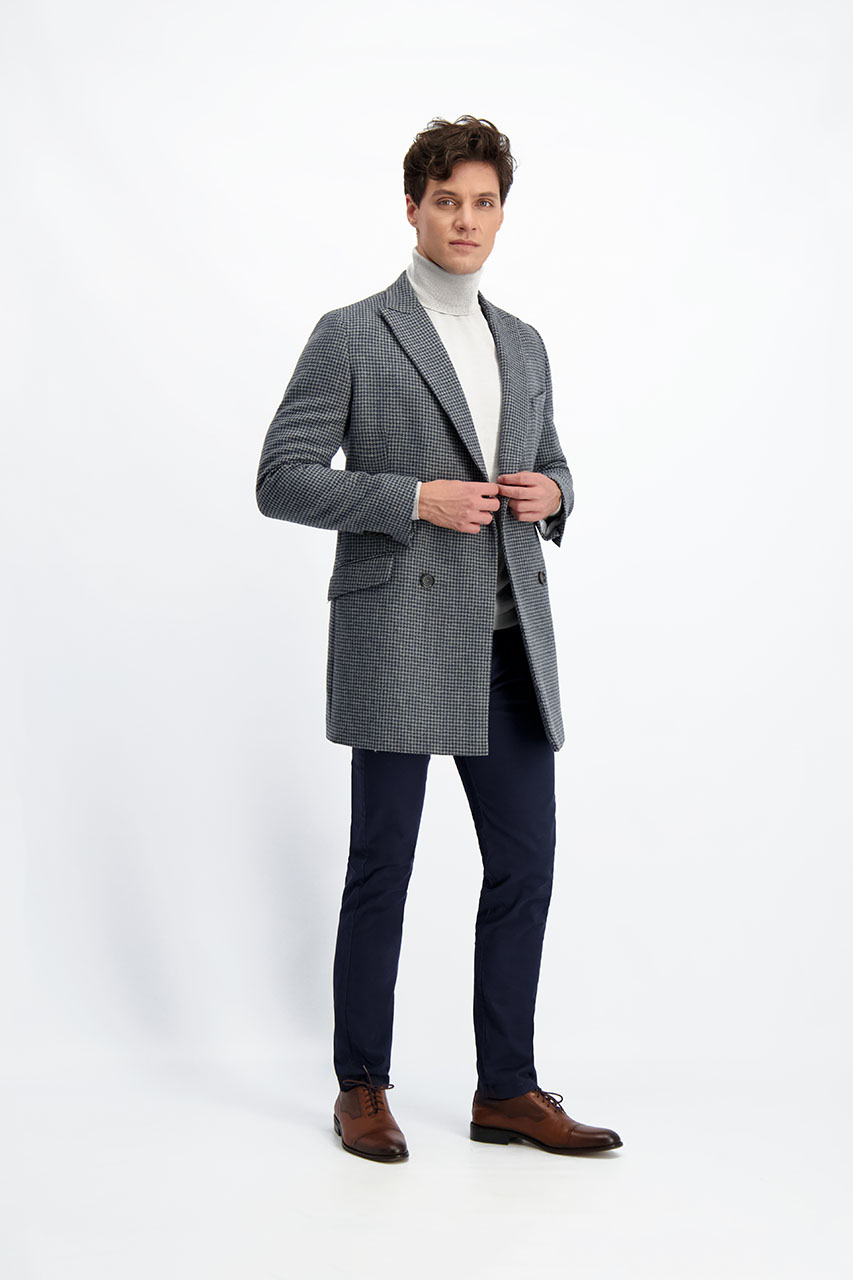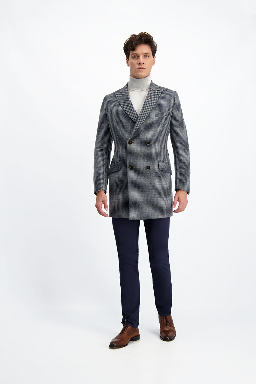 Wełniany płaszcz dwurzędowy męski wykonany z najwyższej jakości wełny. Utrzymany w pięknej szarej i niebieskiej kolorystyce, w modny deseń pepitki. Dodatek włókna syntetycznego niezwykle korzystnie wpływa na komfort użytkowania. Płaszcz zapinany na dwa rzędy guzików, posiada szeroki kołnierz z klapami w szpic. Dwie kieszenie proste zakończone asymetryczna patką oraz jedna kieszeń piersiową. Lekko ocieplony model idealnie sprawdza się w miejskich stylizacjach. Spodoba się mężczyznom lubiącym ciekawe rozwiązania.