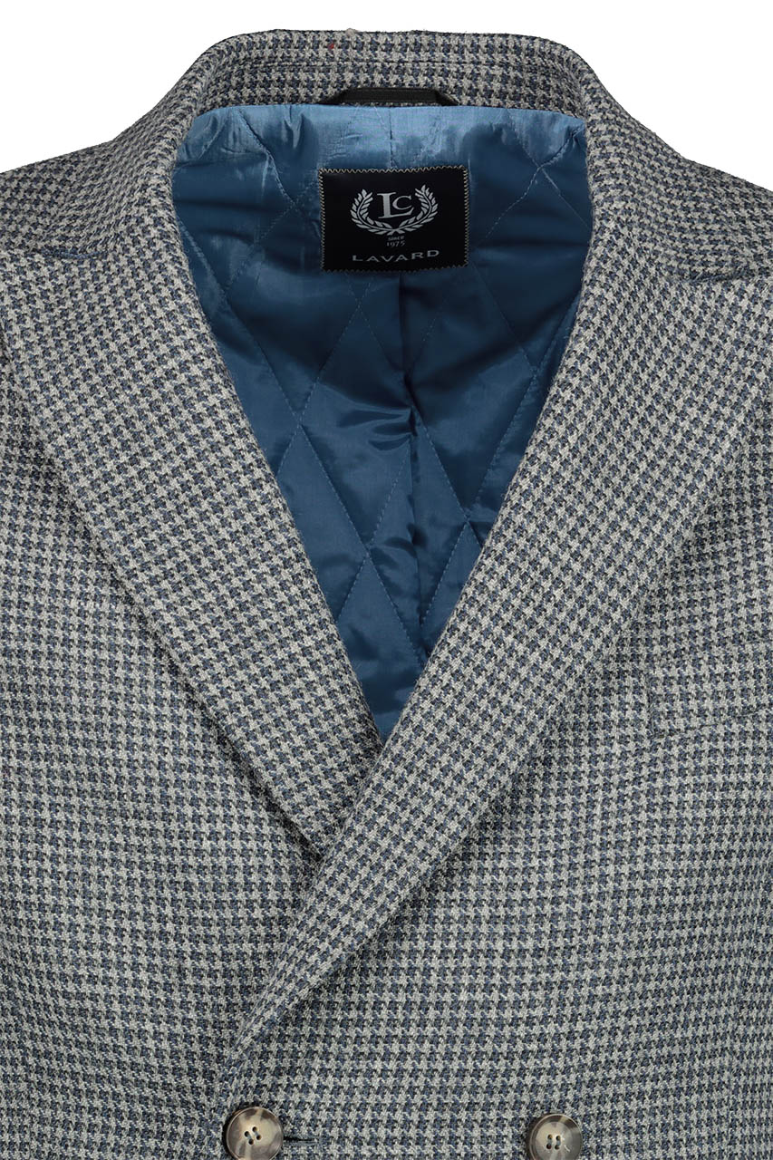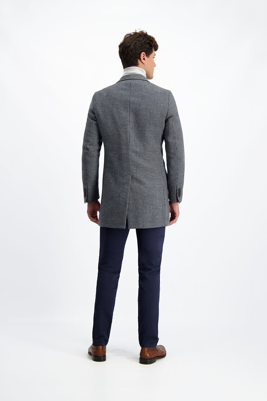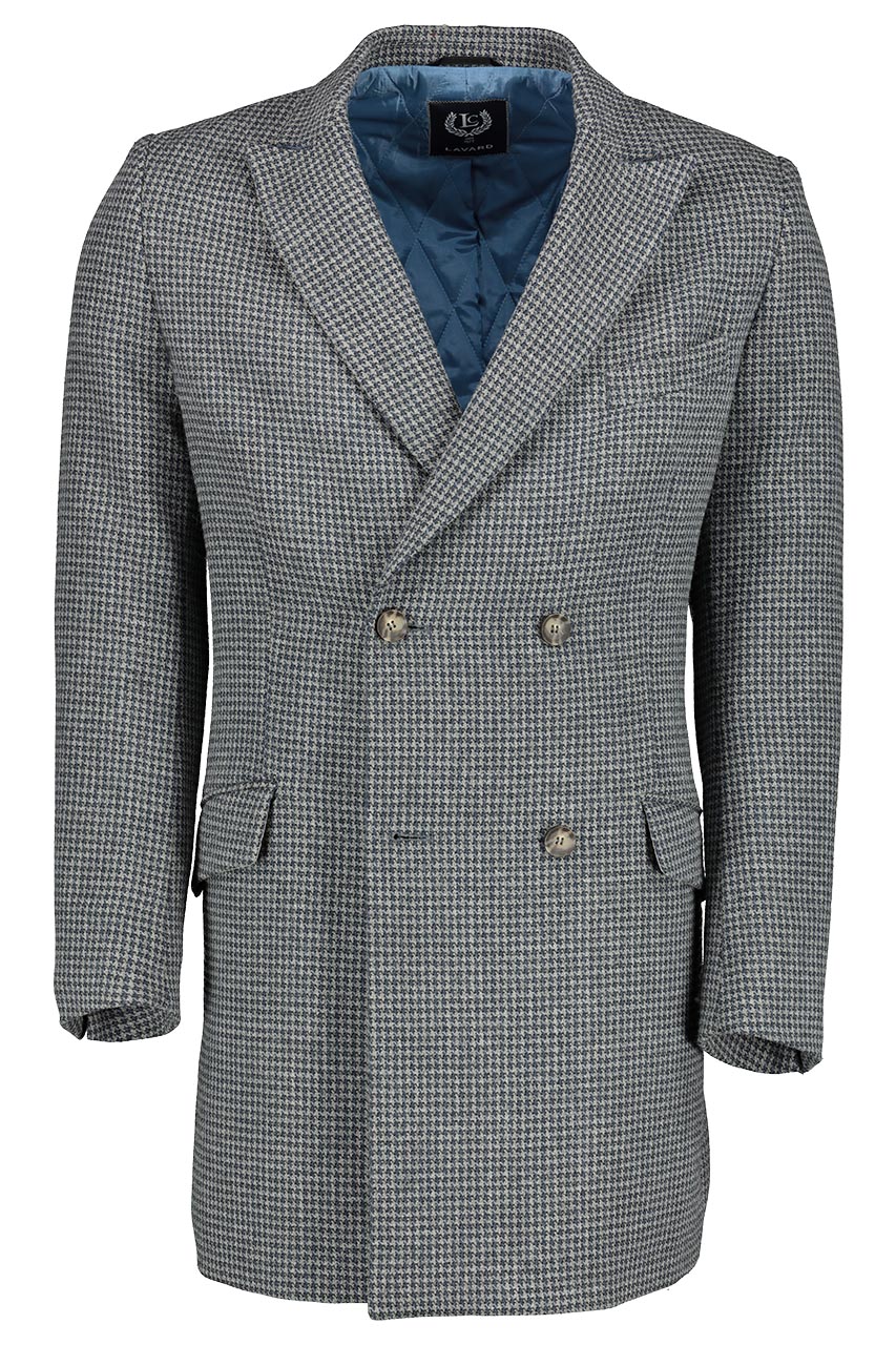Wełniany płaszcz dwurzędowy męski wykonany z najwyższej jakości wełny. Utrzymany w pięknej szarej i niebieskiej kolorystyce, w modny deseń pepitki. Dodatek włókna syntetycznego niezwykle korzystnie wpływa na komfort użytkowania. Płaszcz zapinany na dwa rzędy guzików, posiada szeroki kołnierz z klapami w szpic. Dwie kieszenie proste zakończone asymetryczna patką oraz jedna kieszeń piersiową. Lekko ocieplony model idealnie sprawdza się w miejskich stylizacjach. Spodoba się mężczyznom lubiącym ciekawe rozwiązania.