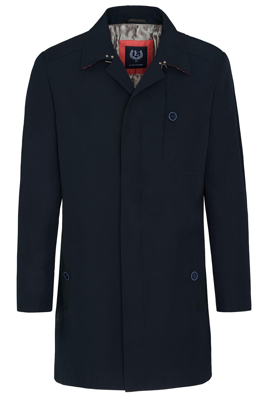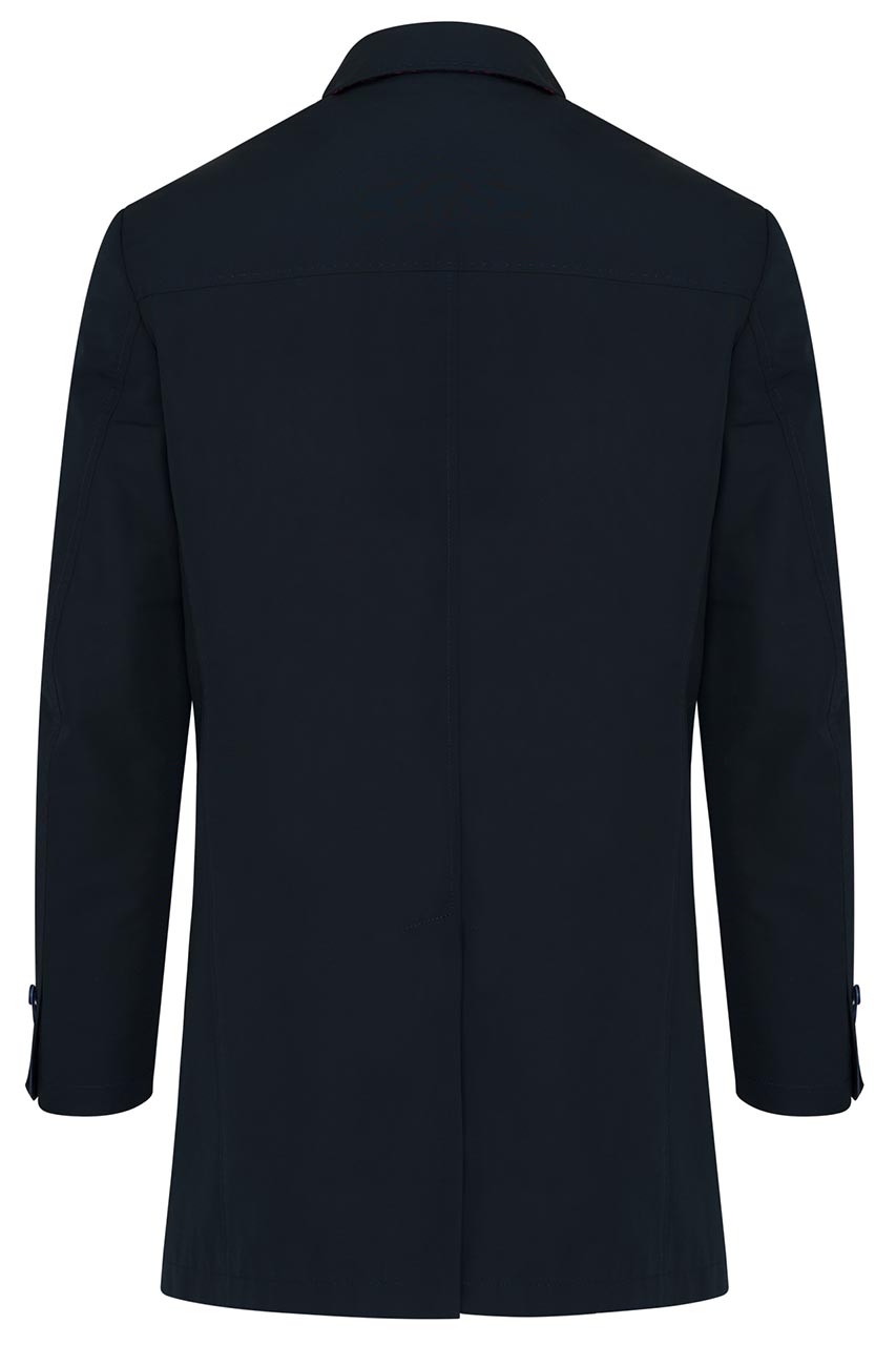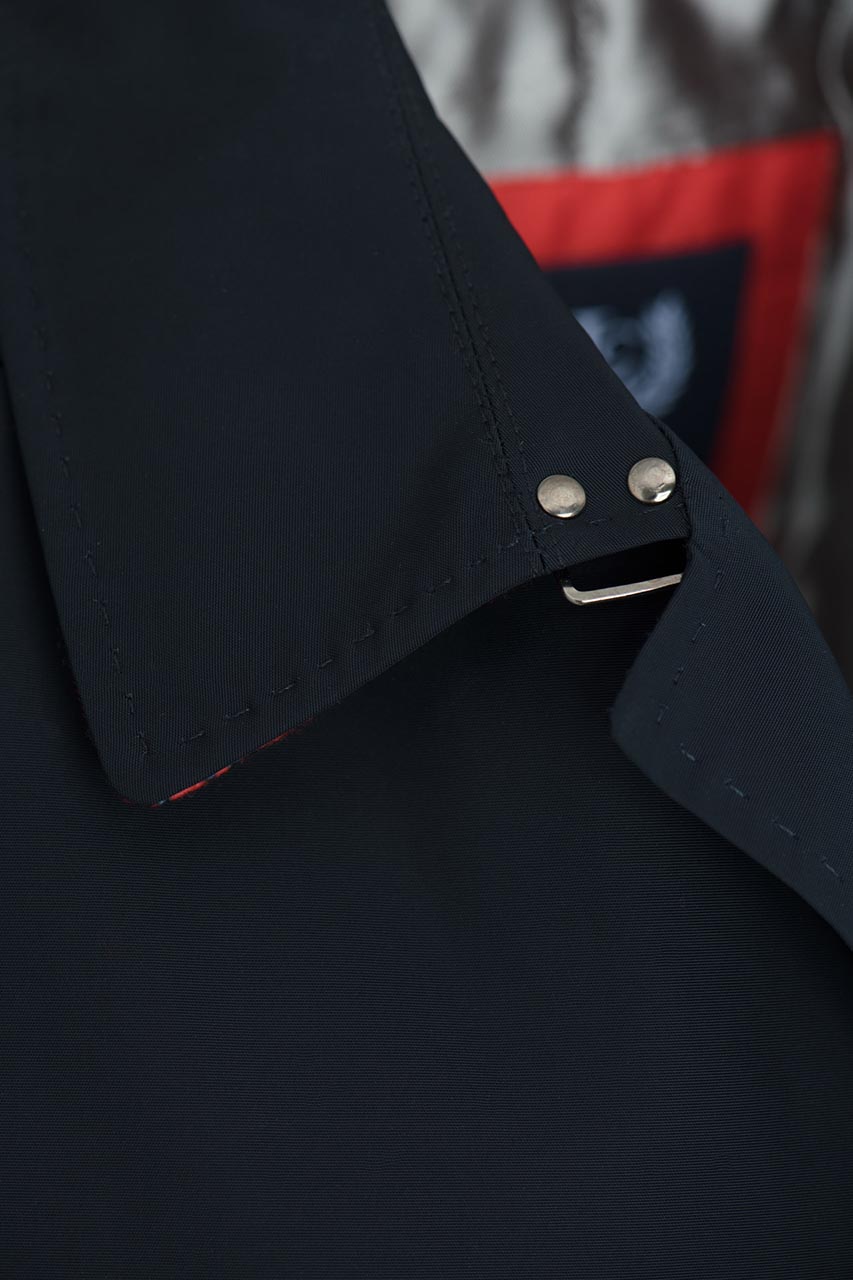 Elegancki płaszcz męski wykonany z materiału w odcieniu głębokiego granatu. Piękny model zapinany na kryte guziki, posiada dwie cięte wygodne kieszenie oraz jedną skośną piersiową. Regularny fason z jednym rozcięciem z tyłu. Płaszcz z ozdobnym podszyciem kołnierza wzorzystym filcem w czarnej i czerwonej tonacji. Ozdobna mała sprzączka przy kołnierzu. Fantastyczna propozycja do eleganckich zestawień z garniturem.
