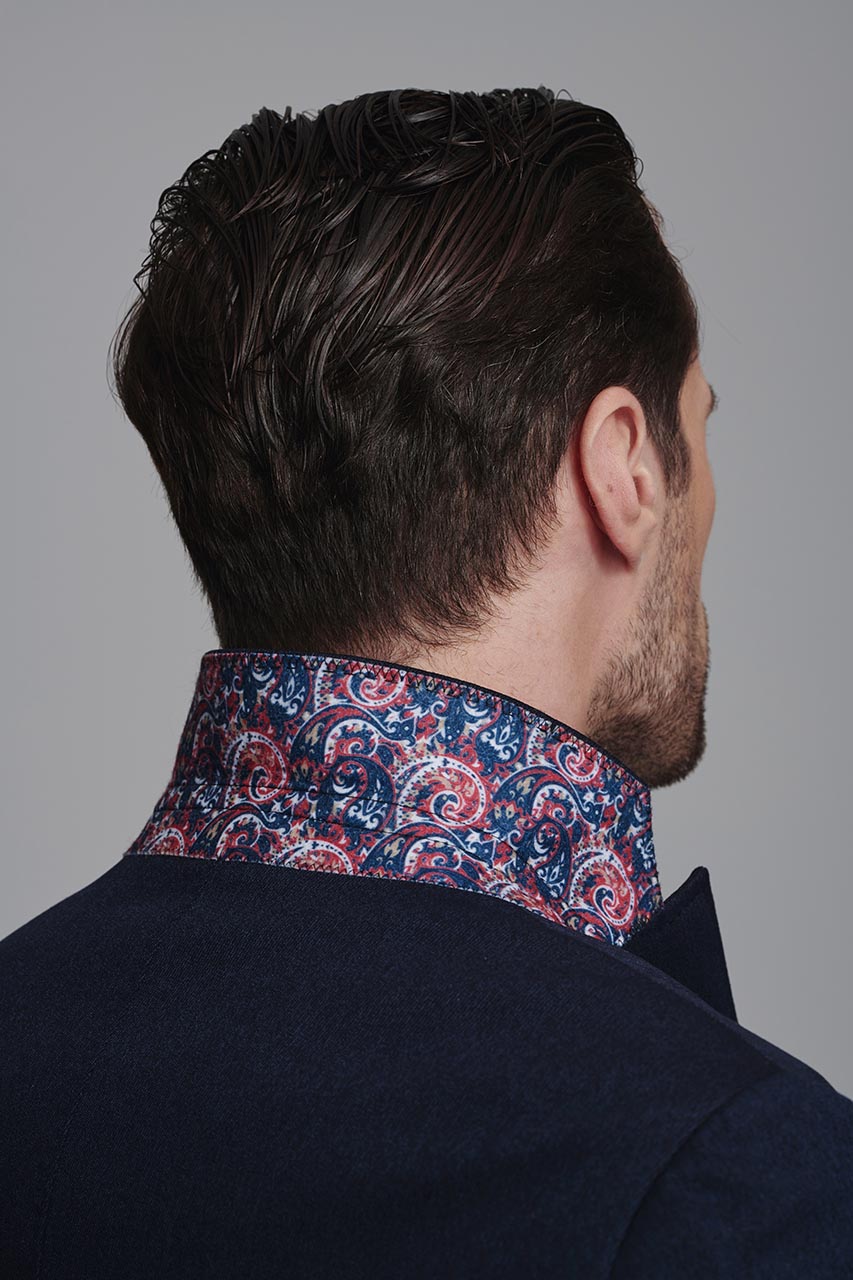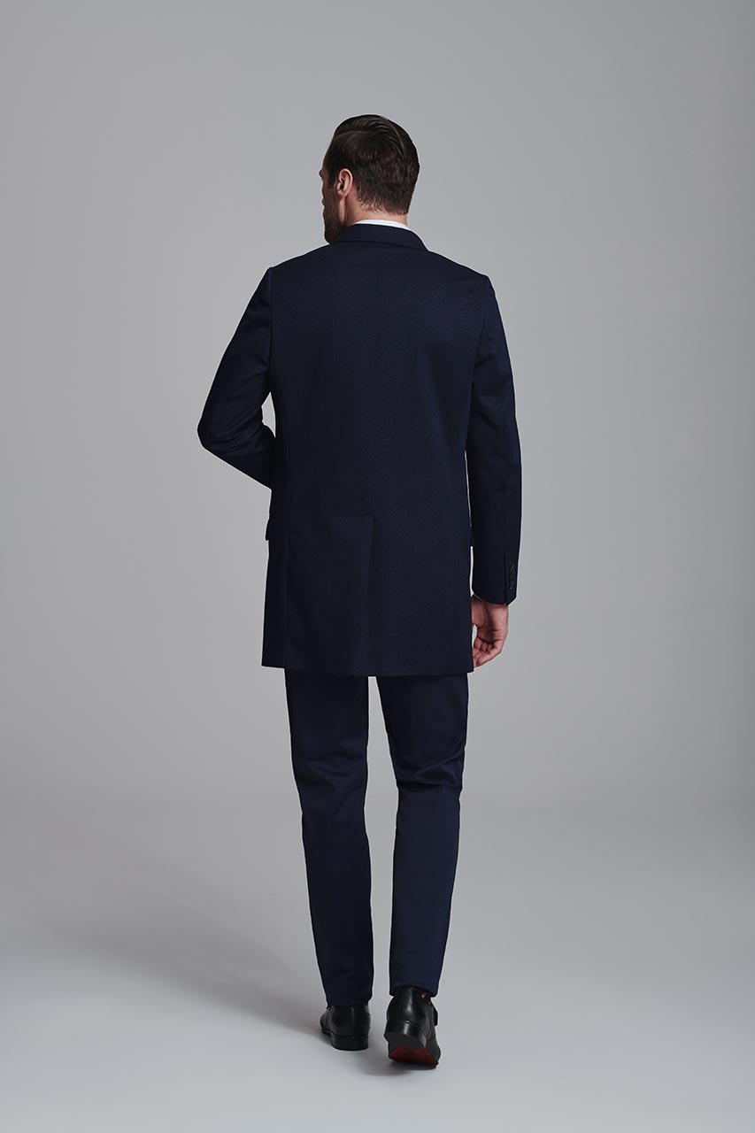 Elegancki płaszcz męski wykonany z przyjemnej w dotyku melanżowej tkaniny w granatowej tonacji. Piękny model o regularnym kroju, zapinany na trzy guziki. Posiada z przodu dwie cięte kieszenie zakończone asymetryczną patką, zegarówkę oraz brustaszę z ozdobnym wzorzystym workiem kieszeniowym który koresponduje z podszewką płaszcza oraz filcem pod kołnierzem. Płaszcz fantastycznie spisze się założony na garnitur.