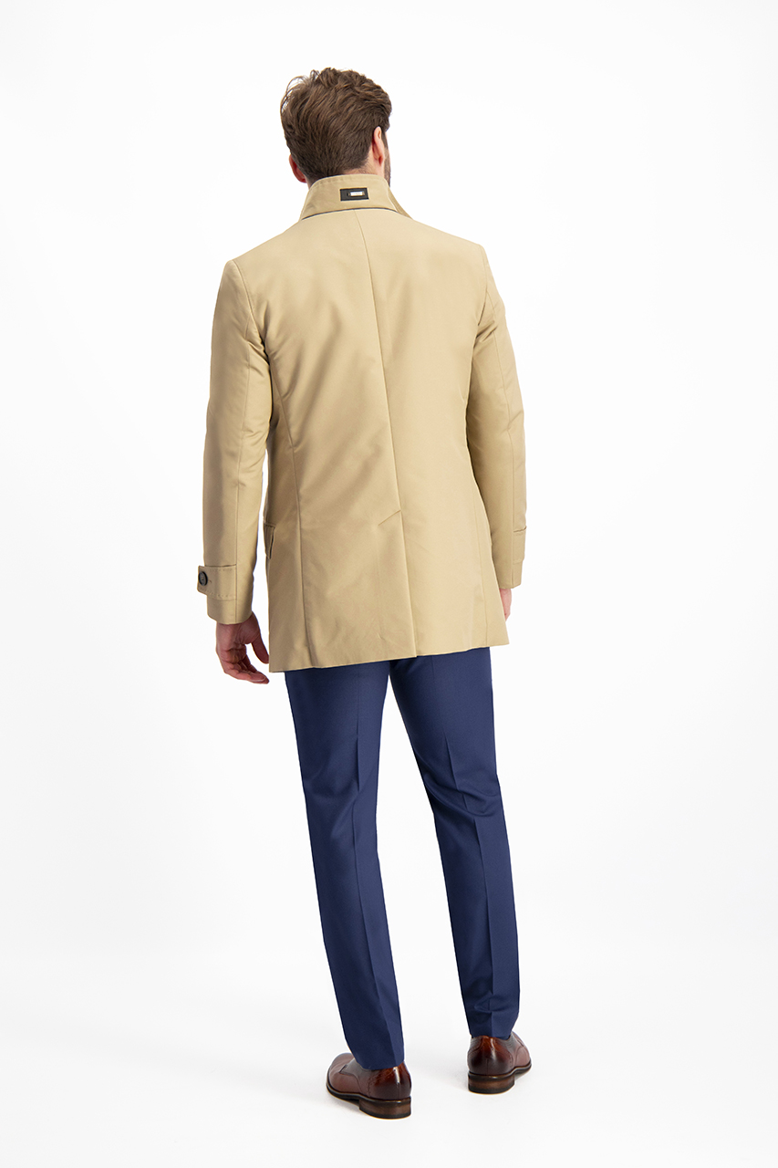 Camelowy płaszcz męski wykonany z gładkiej tkaniny z dodatkiem bawełny. Świetny, dopasowany model z półpodszewką. Zapinany na brązowe guziki, posiada dwie kieszenie z patką oraz zegarówkę zapinaną na zamek. Płaszcz fantastycznie prezentuje się w casualowych zestawieniach z spodniami chino i z koszulą. Pięknie wygląda także w zestawie z garniturem.