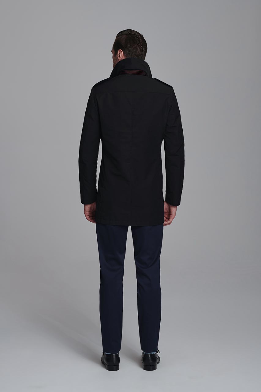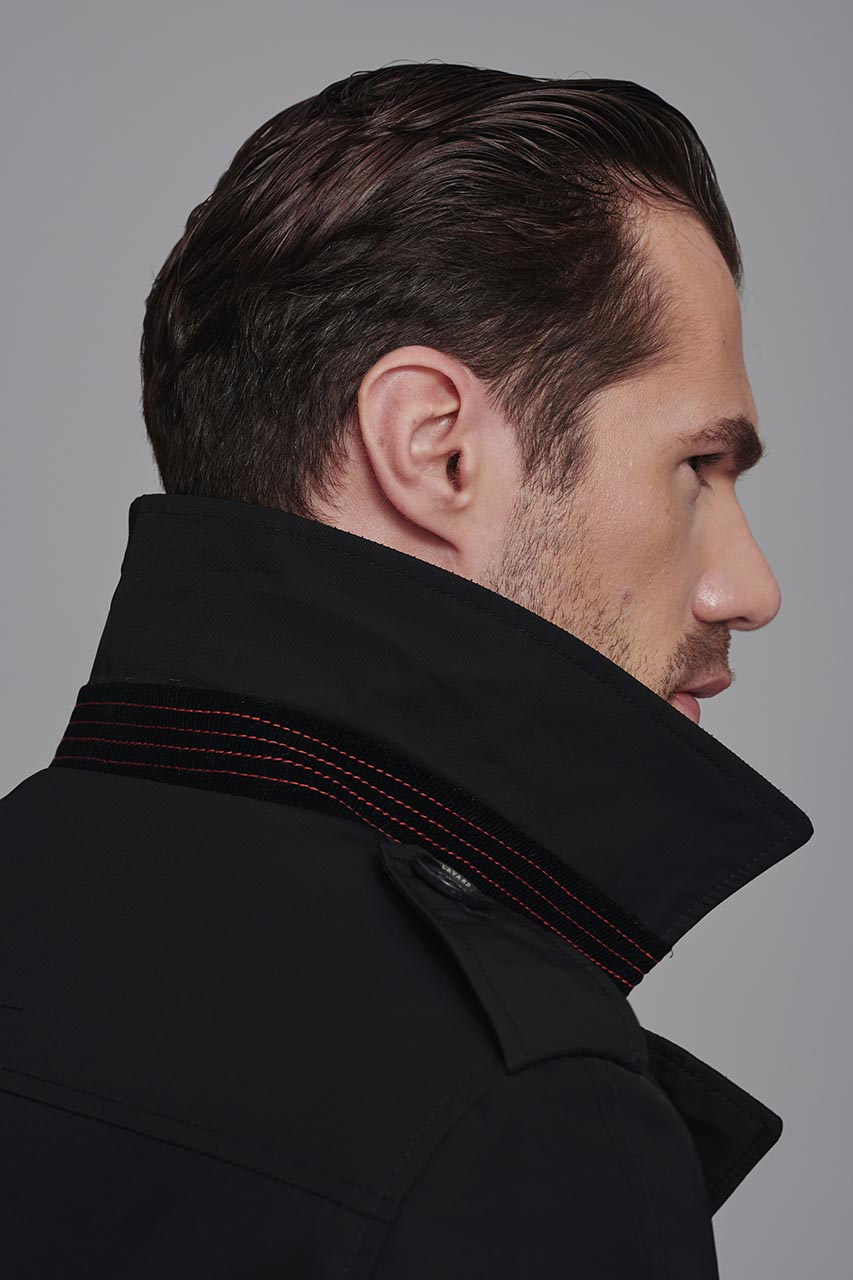 Klasyczny i ponadczasowy czarny płaszcz dwurzędowy męski. Posiada dwie cięte kieszenie po bokach i ozdobne pagony na ramionach. Kołnierz wykończony od spodu czarnym sztruksem przeszytym nićmi w kontrastowym czerwonym odcieniu. Uniwersalny fason płaszcza sprawia, że doskonale prezentuje się on z garniturem jak i z mniej formalnym zestawem.