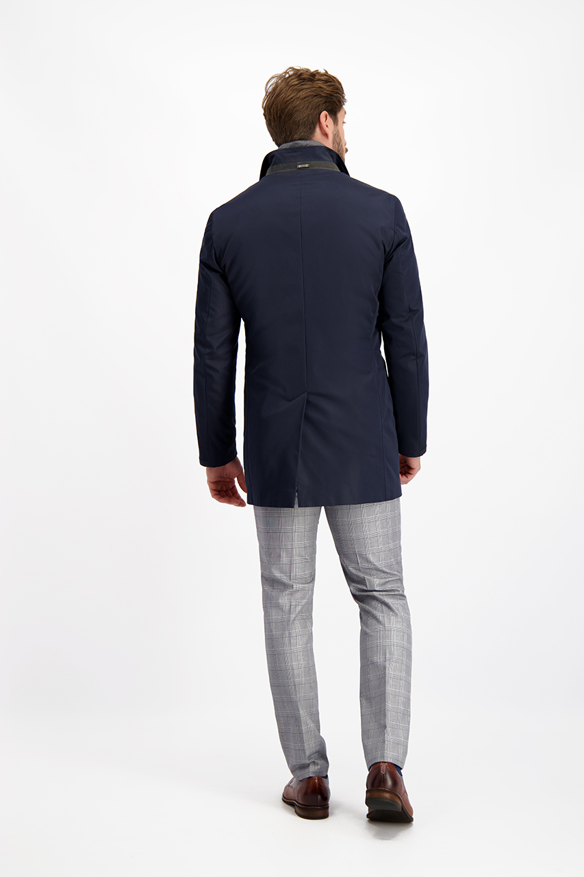 Granatowy płaszcz męski wykonany z tkaniny o właściwościach wodoodpornych oraz wiatroodpornych. Ponadczasowy model z panelem docieplającym w szarym odcieniu, który można odpiąć. Nowoczesna propozycja o klasycznym fasonie. Zapinana na zamek i guziki. Posiada dwie kieszenie skośne. Płaszcz świetnie prezentuje się zarówno z garniturem jak i z spodniami chino i z golfem.