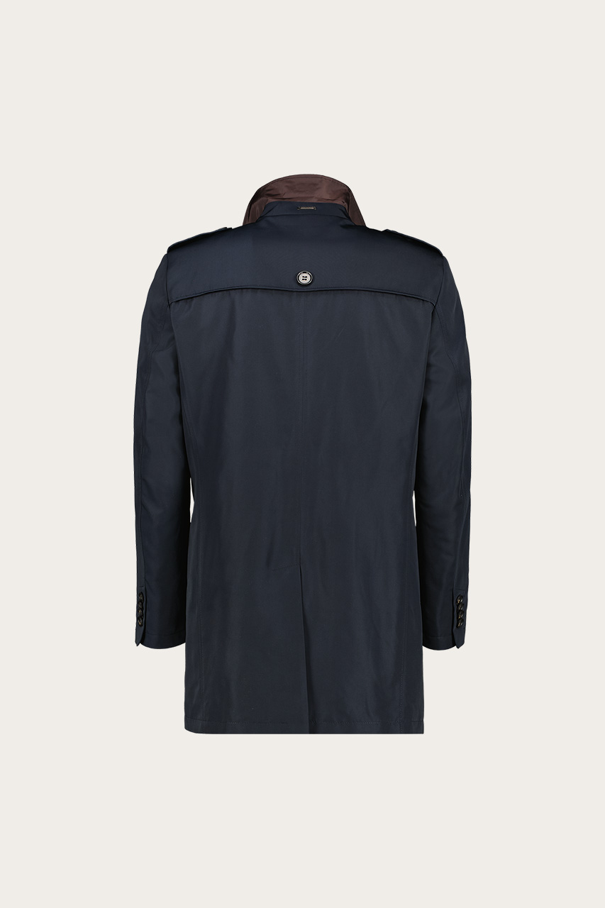 Granatowy płaszcz męski o klasycznym fasonie. Model uszyty z gładkiej tkaniny o delikatnym, satynowym połysku. Zapinany na guziki. Posiada dwie kieszenie. Płaszcz wyprodukowany w Polsce.