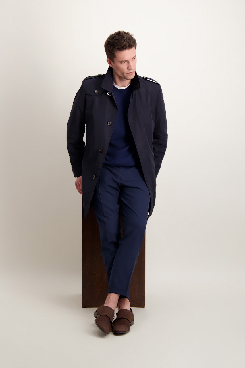 Granatowy płaszcz męski o klasycznym fasonie. Model uszyty z gładkiej tkaniny o delikatnym, satynowym połysku. Zapinany na guziki. Posiada dwie kieszenie. Płaszcz wyprodukowany w Polsce.