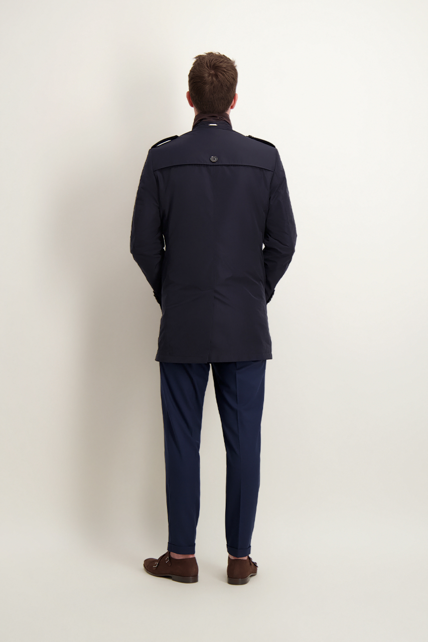 Granatowy płaszcz męski o klasycznym fasonie. Model uszyty z gładkiej tkaniny o delikatnym, satynowym połysku. Zapinany na guziki. Posiada dwie kieszenie. Płaszcz wyprodukowany w Polsce.
