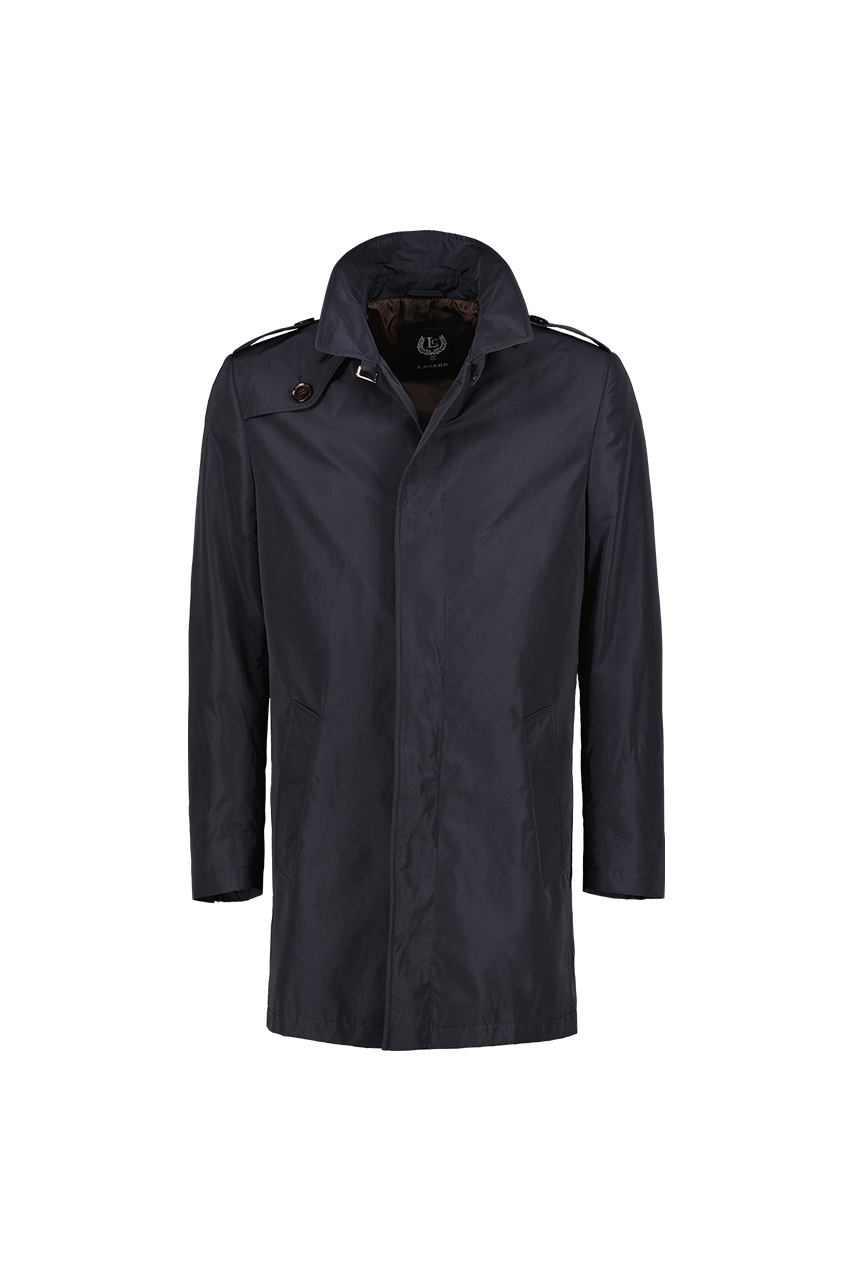 Granatowy płaszcz o klasycznym fasonie, uszyty z gładkiej tkaniny o delikatnie satynowym połysku. Model nieocieplony, zapinany na guziki. Posiada dwie kieszenie po bokach. Wyprodukowany w Polsce.