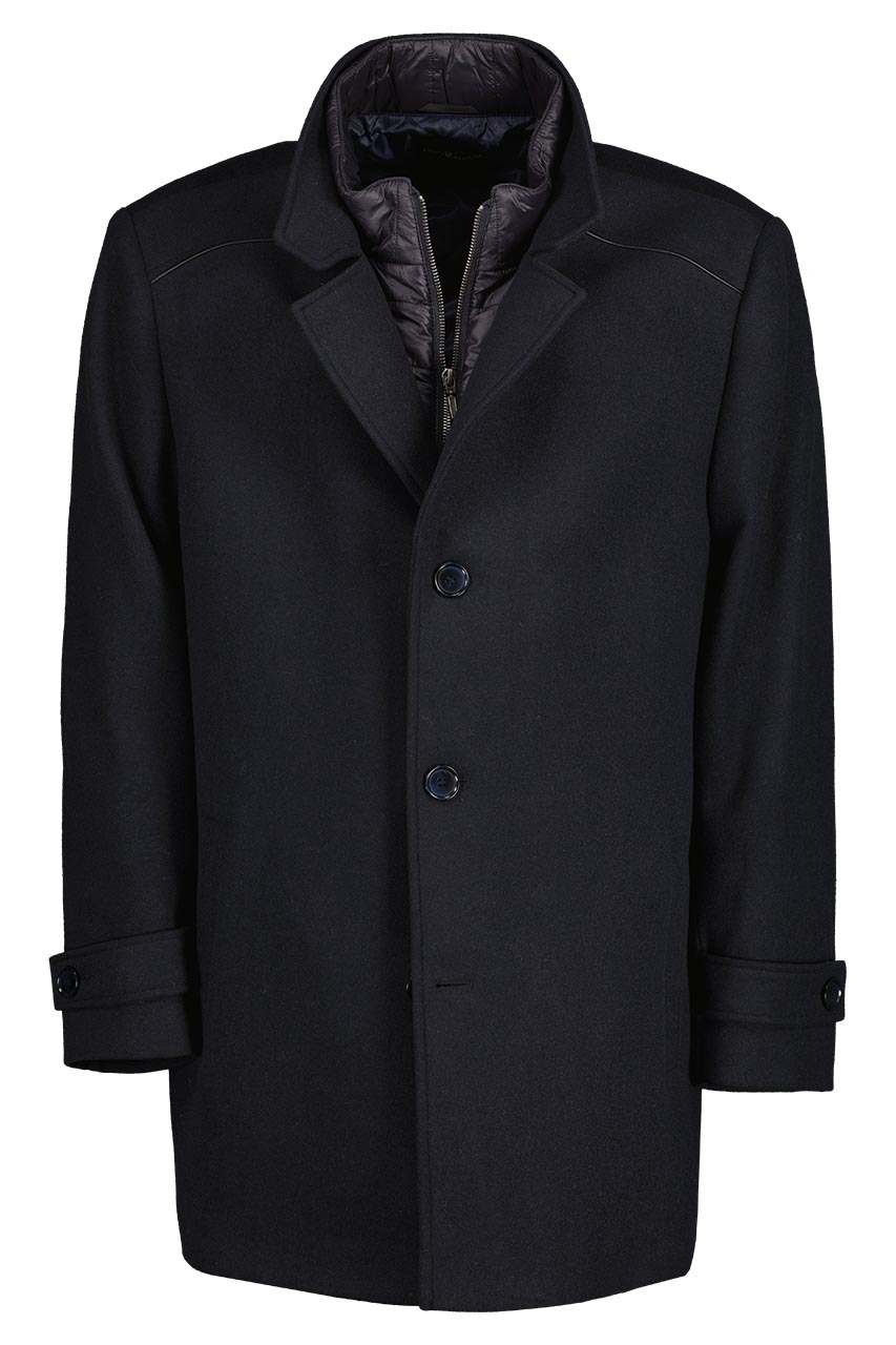 Granatowy płaszcz uszyty z przyjemnej w dotyku tkaniny z dodatkiem wełny. Model o regularnym kroju, zapinany na guziki. Posiada dodatkowy panel ocieplający, który można wypiąć.