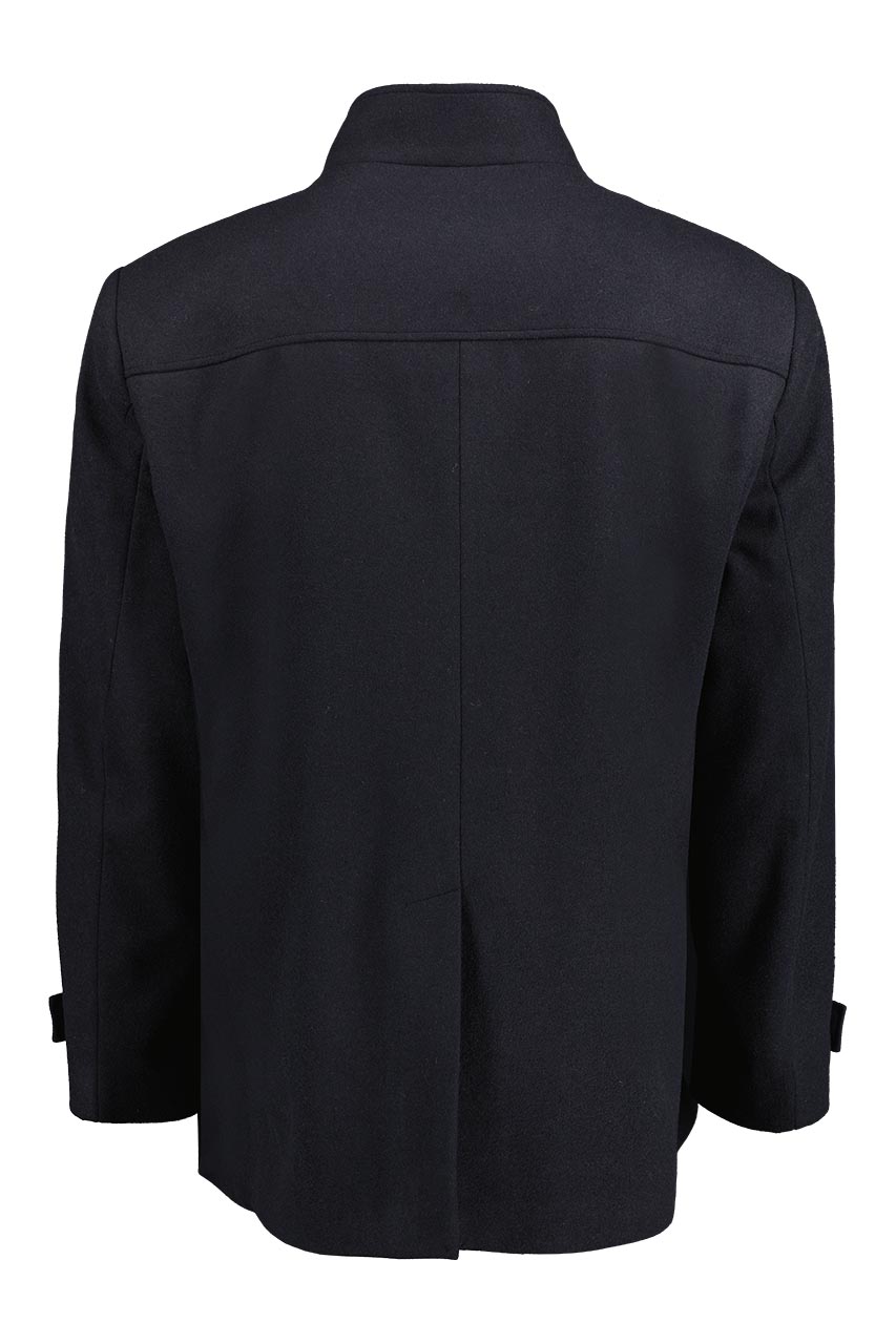 Granatowy płaszcz uszyty z przyjemnej w dotyku tkaniny z dodatkiem wełny. Model o regularnym kroju, zapinany na guziki. Posiada dodatkowy panel ocieplający, który można wypiąć.