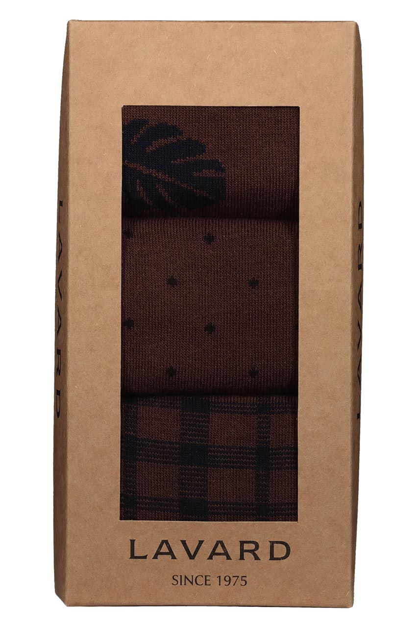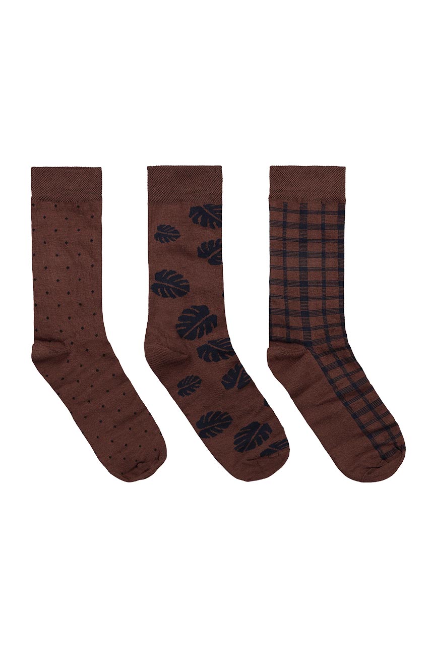 Zestaw skarpet we wzory wykonanych z wysokiej jakości bawełny. To komfortowe propozycje z bezszwowym łączeniem. Dzięki naturalnym właściwościom bawełny skarpety zapewniają komfort termiczny, cyrkulację powietrza oraz uczucie suchości stóp. Bawełna charakteryzuje się także wysoką wytrzymałością, dzięki czemu skarpety nie wylądują w koszu po krótkim czasie użytkowania. Modele posiadają nieuciskający ściągacz, co znacznie wpływa na wygodę. Zestaw utrzymany w granatowej i brązowej tonacji.