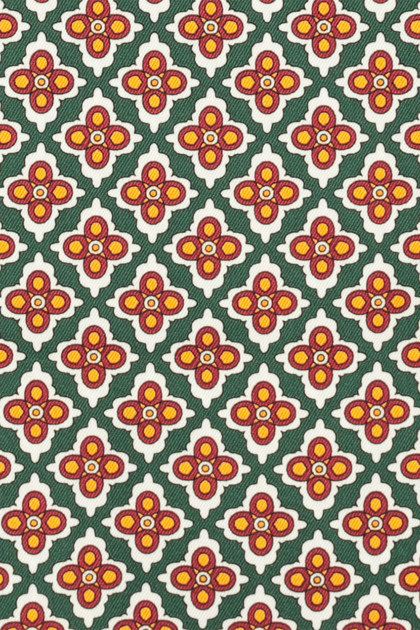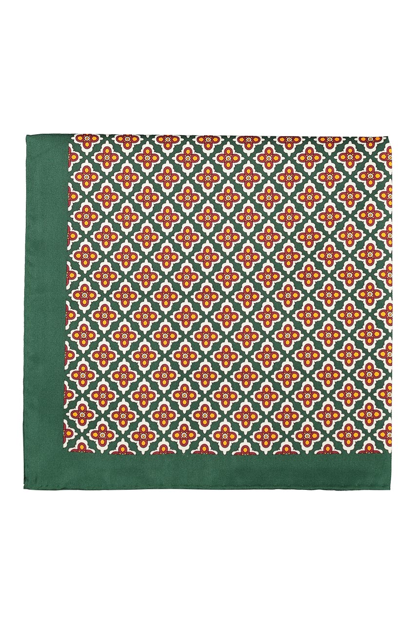 Zielona poszetka w drobny wzór kwiatów. Wykonana z przyjemnego, delikatnego materiału. Model z dominującymi odcieniami zieleni i pomarańczy. Świetnie prezentuje się zarówno z jasnymi jak i z ciemnymi marynarkami.
