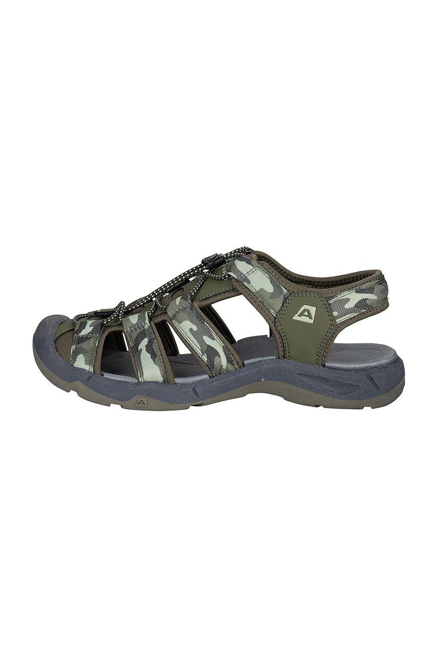 Lekkie sandały sportowe we wzór moro, utrzymane w zielonym odcieniu. Buty z wytrzymałą gumową podeszwą. Zostały wykonane z syntetycznej tkaniny z otworami zapewniającymi wentylację. Jest to model przeznaczony na długie spacery oraz letnie wędrówki górskie. Solidna, antypoślizgowa i odporna na ścieranie podeszwa zapewnia komfort użytkowania nawet po kilku godzinach marszu, a otwory pozwalają oddychać skórze.