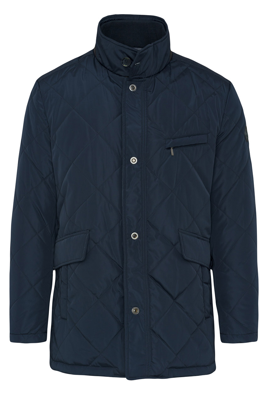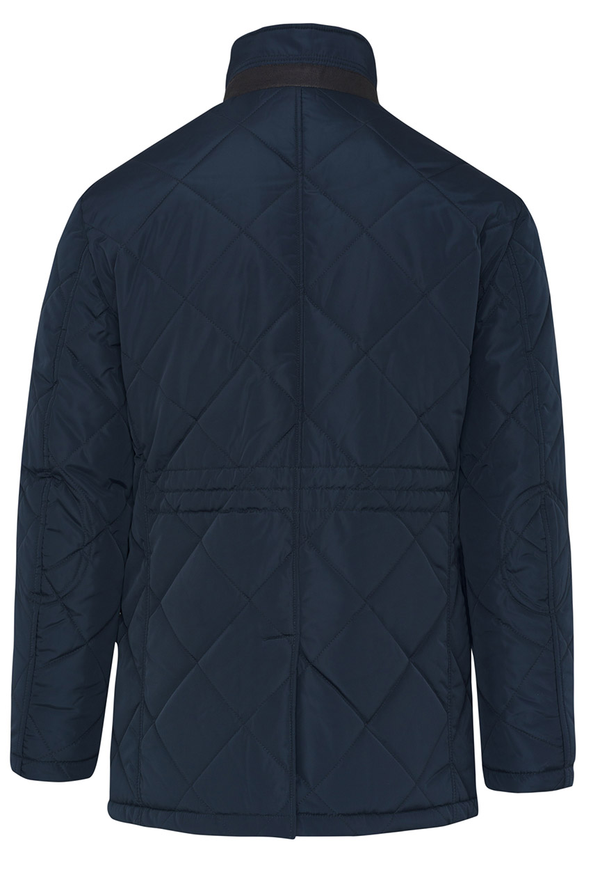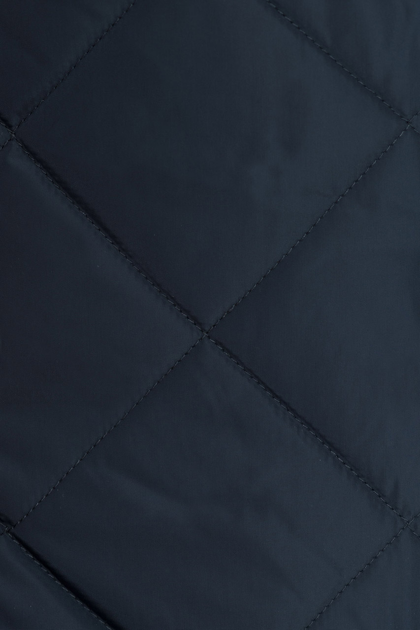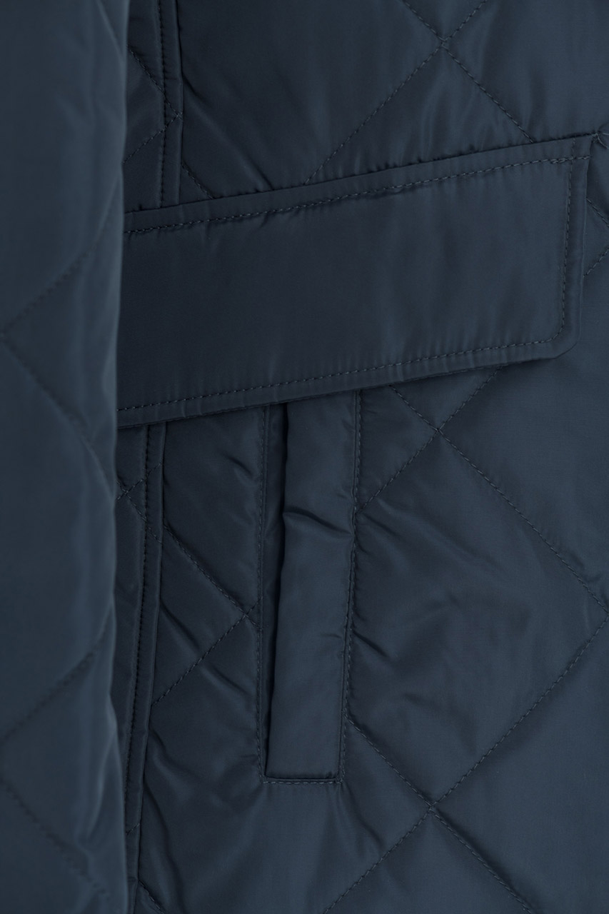 Pikowana kurtka o casualowym charakterze. Uszyta z tkaniny w granatowym kolorze. Posiada kryte zapięcie na zamek i napy. Z przodu dwie skośne, cięte kieszenie zakończone ozdobną asymetryczną patką oraz jedna kieszeń piersiowa zapinana na zamek. Model o przedłużonym kroju, posiada wszyty tunel umożliwiający regulację w pasie. Kurtka świetnie sprawdzi się w miejskich stylizacjach.