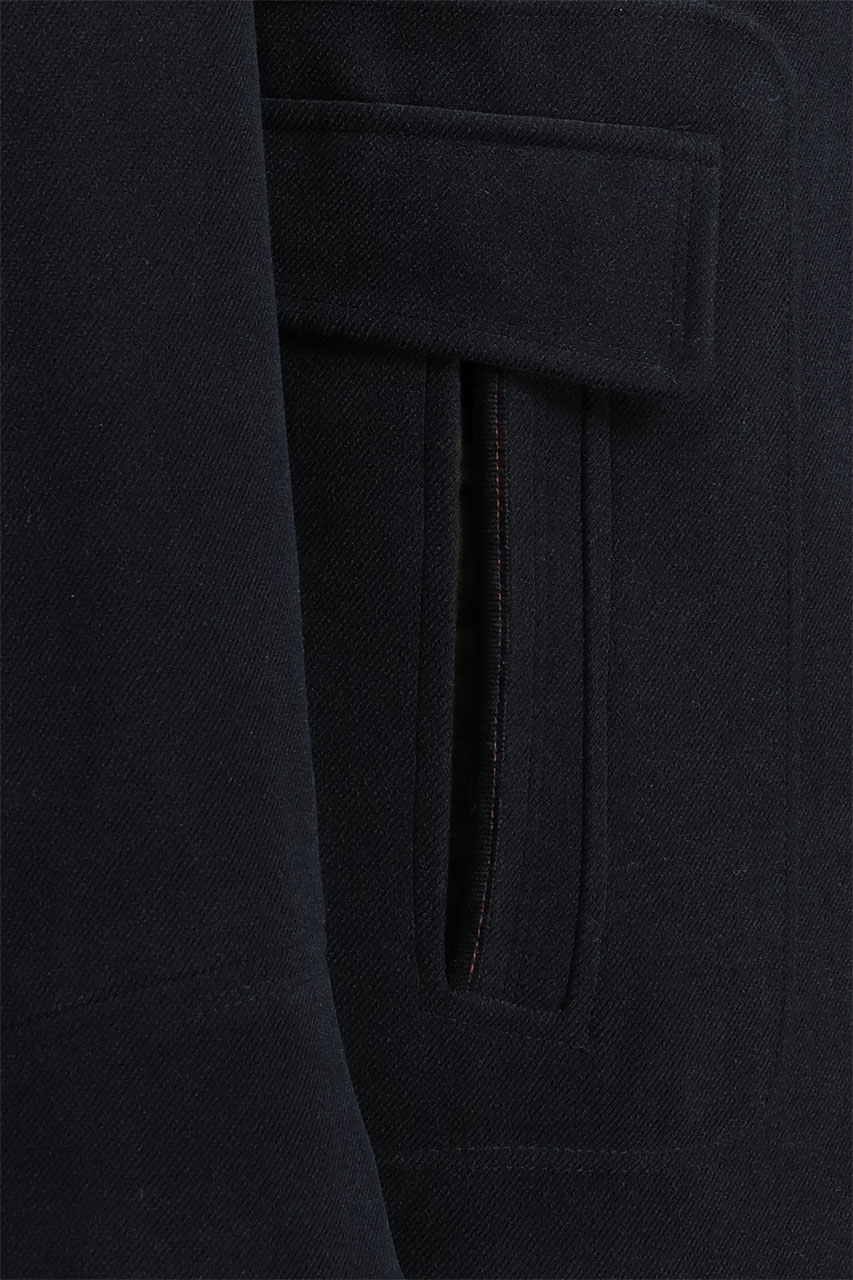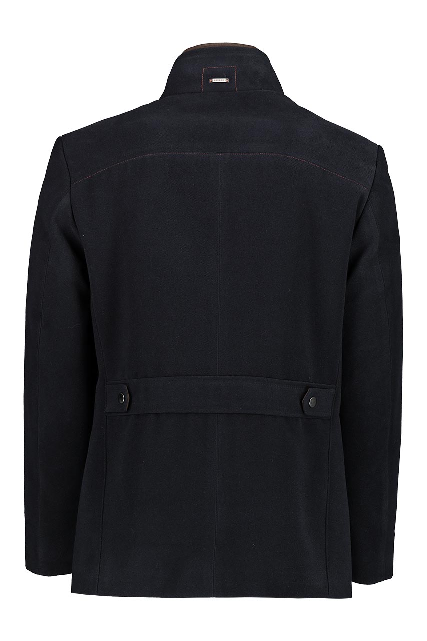 Wełniana kurtka męska wykonana z wysokiej jakości wełnianej tkaniny. Model utrzymany w głębokim odcieniu granatu. Zapinany na zamek i kryte napy. Posiada dwie kieszenie proste zakończone patką oraz dwie piersiowe zapinane na zamek. Propozycja z podwójną stójką wykończoną wewnątrz tkaniną skóropodobną. Kurtka doskonale prezentuje się w miejskich zestawieniach z swetrem lub grubym wełnianym golfem.