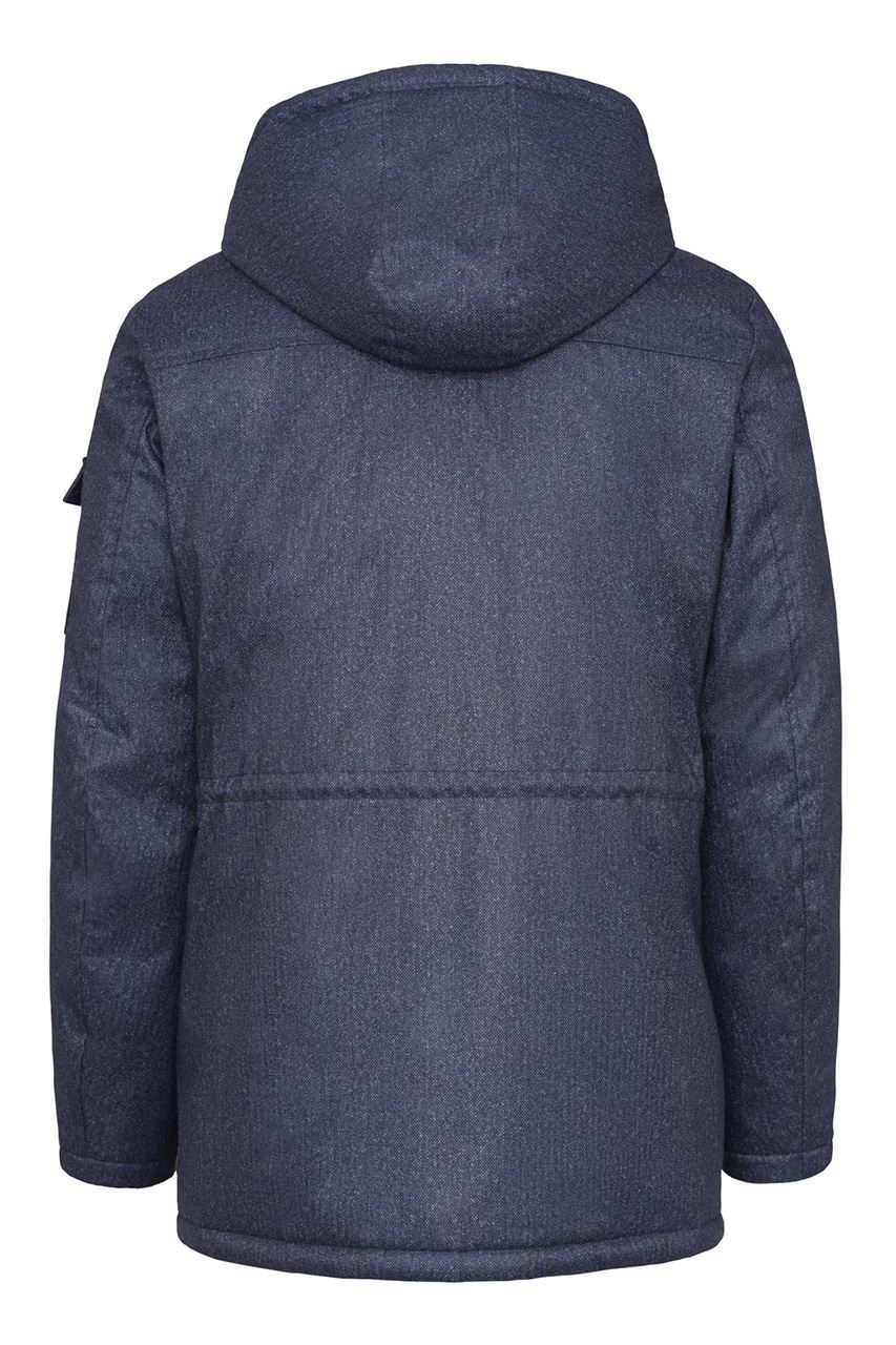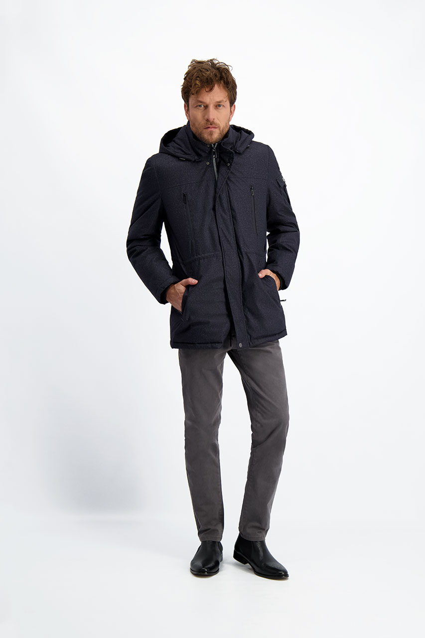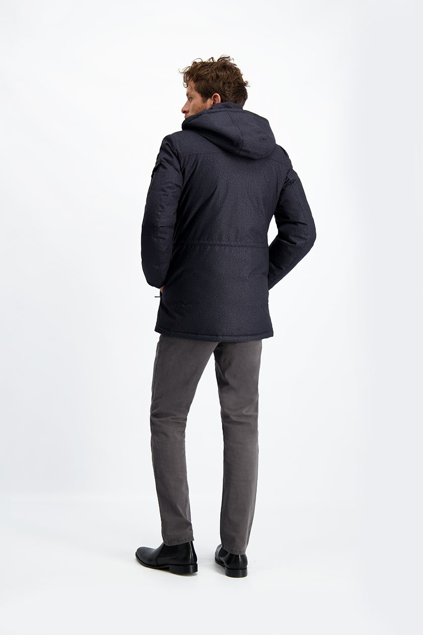 Sportowa kurtka wykonana z materiału o właściwościach wodoodpornych w kolorze granatowego melanżu. Przedłużany model z możliwością regulacji w pasie. Posiada praktyczny odpinany kaptur oraz liczne funkcjonalne kieszenie na zewnątrz i w środku. Kurtka zapinana na zamek i kryte napy. Wygodne ściągacze w rękawach dodatkowo chronią przed utratą ciepła. Ponadczasowy model.