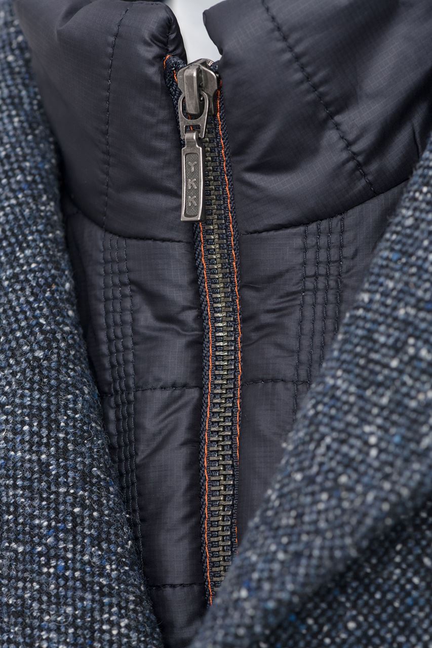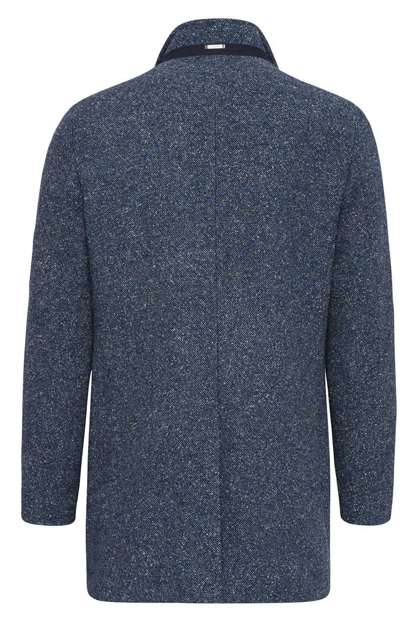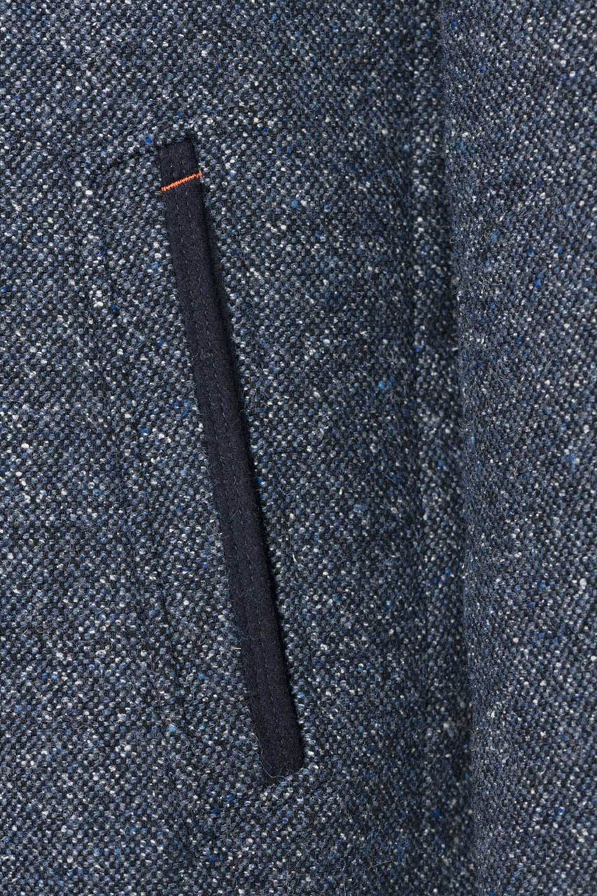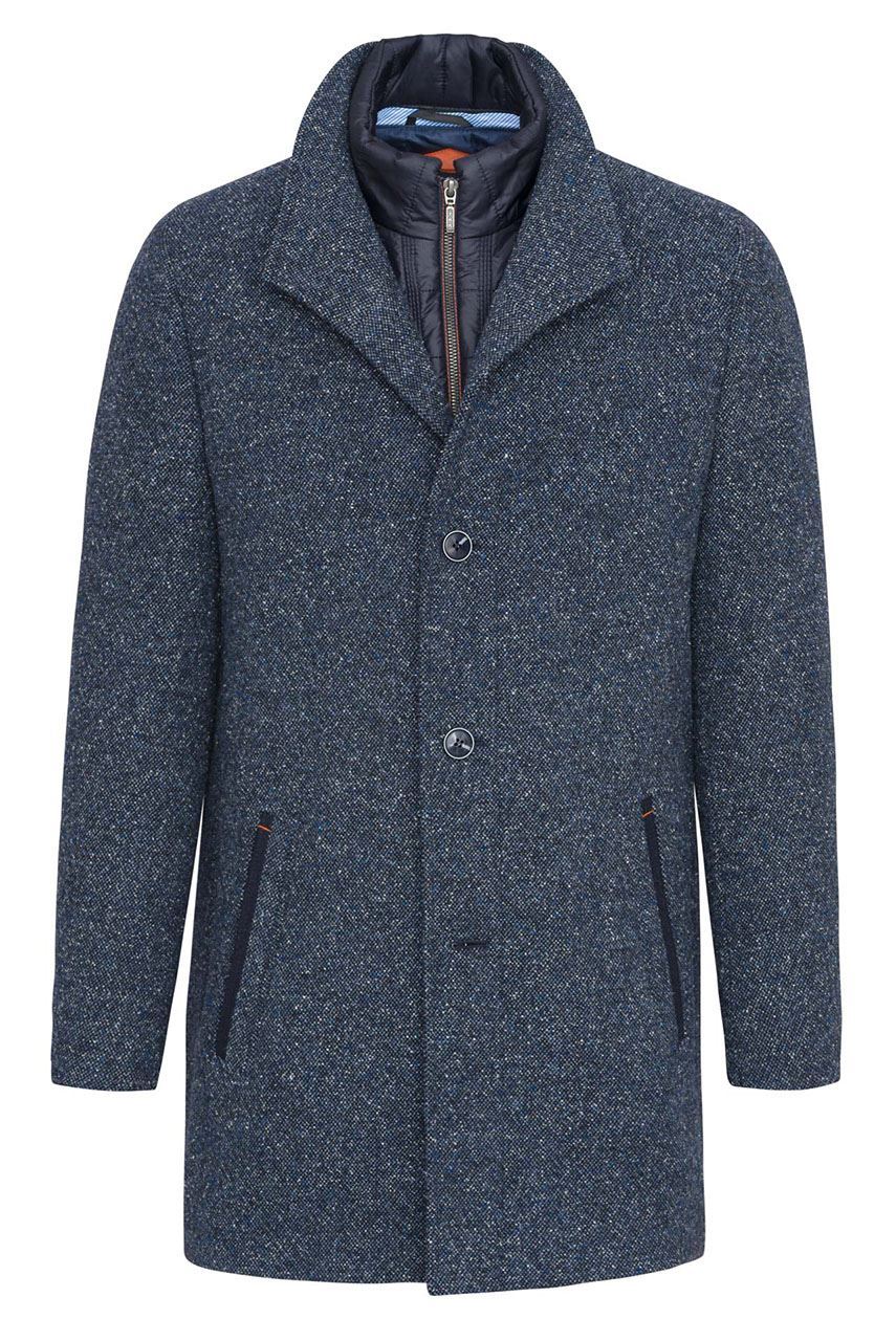 Płaszcz męski o regularnym kroju, utrzymany w granatowej kolorystyce. Wykonany z wysokiej jakości melanżowej, wełnianej tkaniny z dodatkiem kaszmiru, jedwabiu i włókien syntetycznych. Zapinany na zamek i guziki utrzymane w podobnej tonacji. Z przodu dwie cięte, skośne kieszenie, z tyłu jedno rozcięcie. Model posiada funkcjonalny, wypinany kołnierz. Idealny zarówno do eleganckich, jak i mniej formalnych stylizacji.